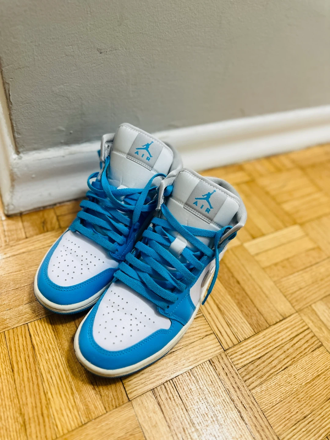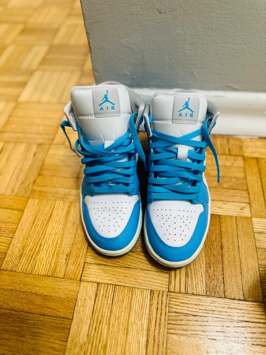 60Selling a pair of Air Jordan 1 Mid sneakers in a lovely white and blue colourway! They're in great condition and come with the original box. Size is a US 7 women’s. Premium leather upper with perforations for breathability. Encapsulated Nike Air unit provides lightweight cushioning. Rubber outsole with circular traction pattern.