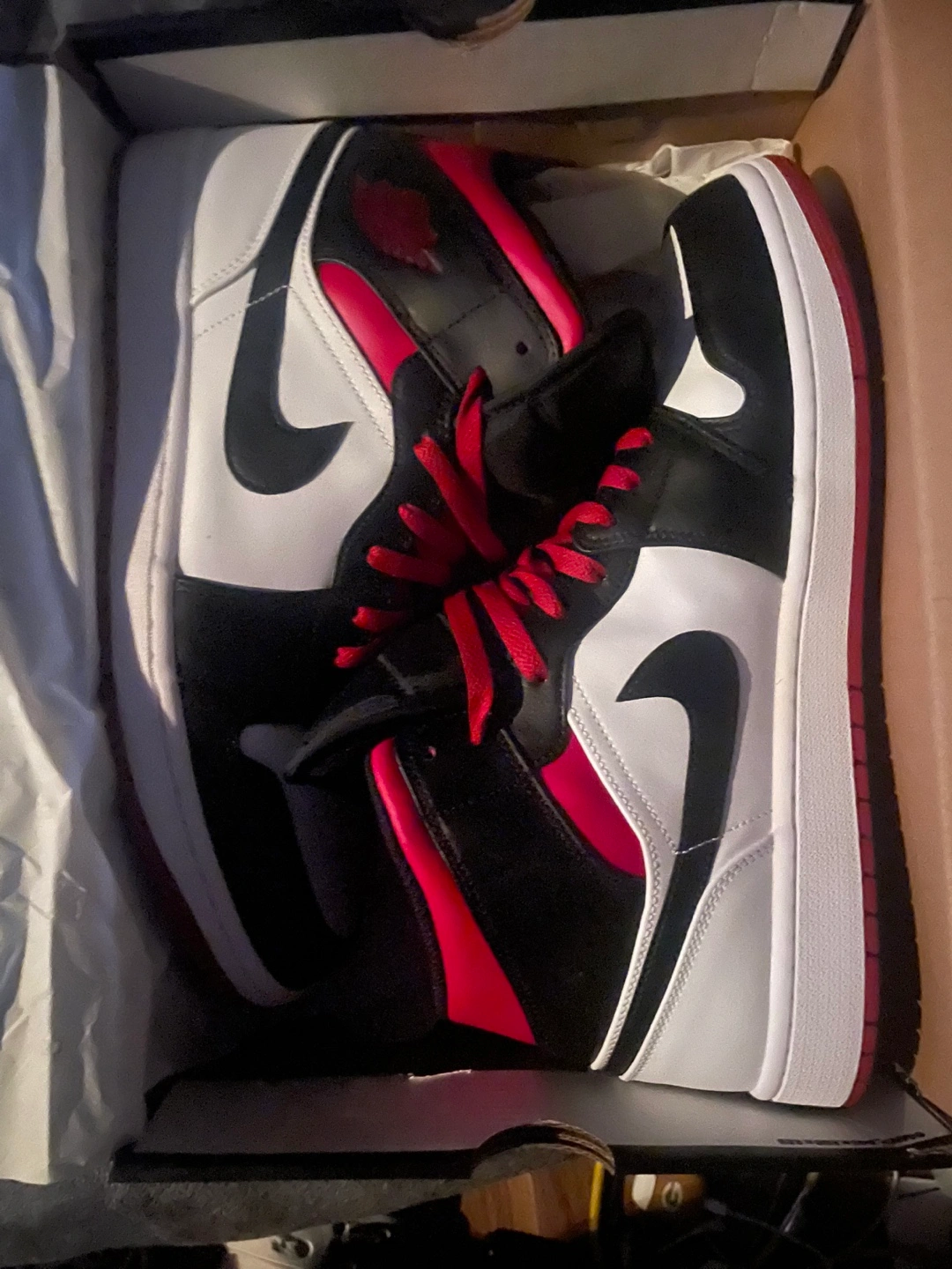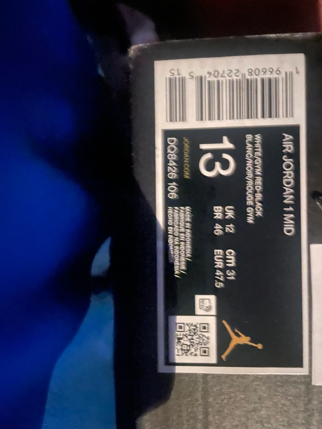 Selling a pair of Air Jordan 1 Mid sneakers in white, gym red, and black. They are a size 13. Comes with the box! Brand new never out of box