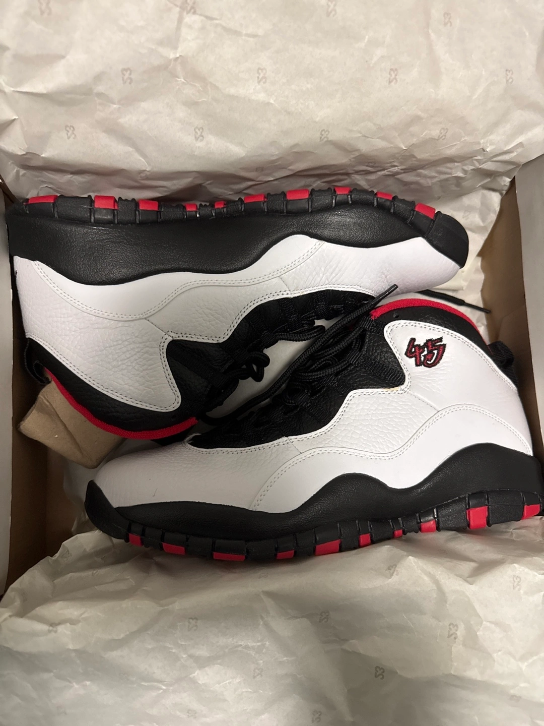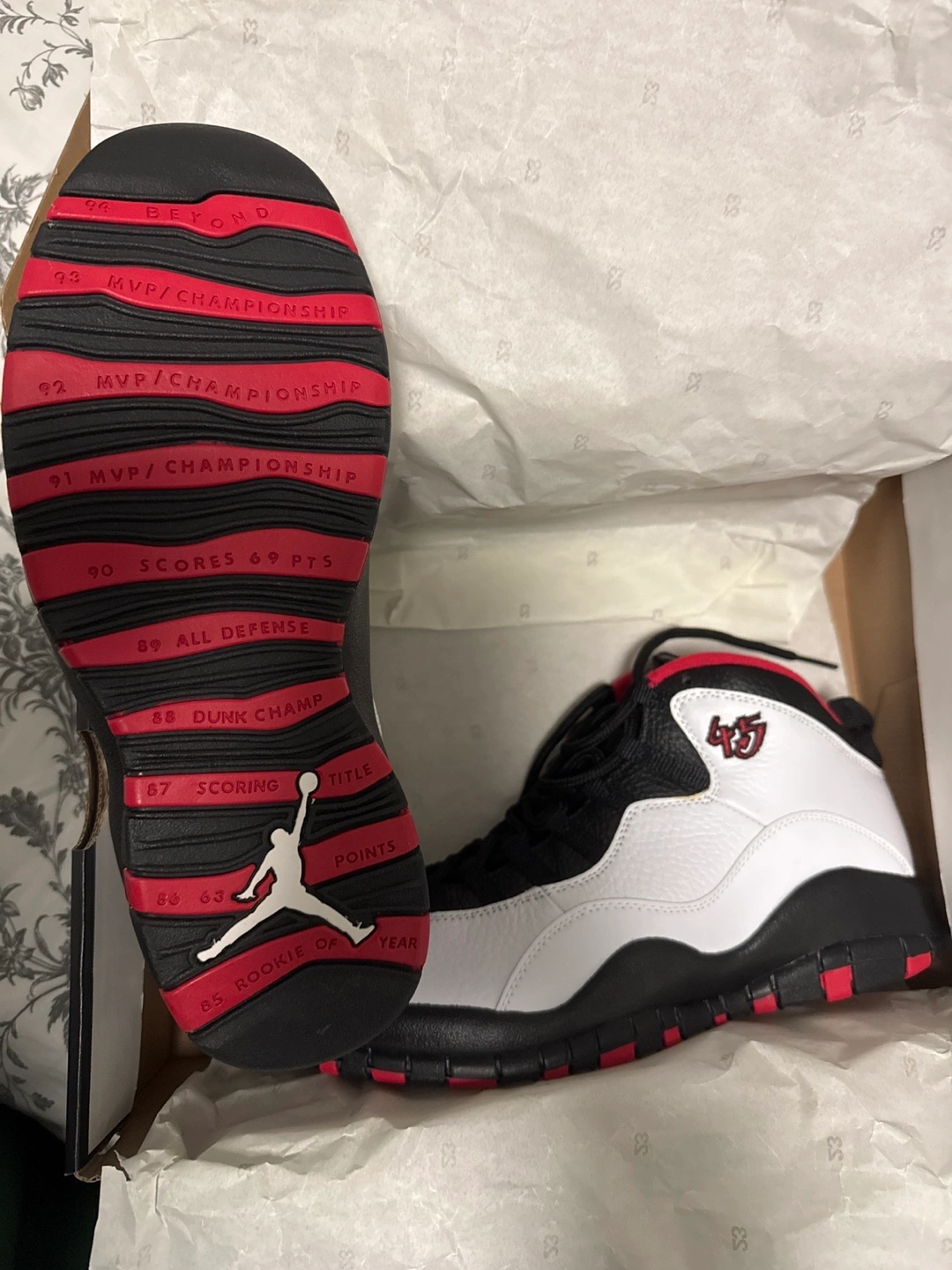 Rare Air Jordan 10s. Black, white, and red colourway. Features unique details on the sole. Size not shown.