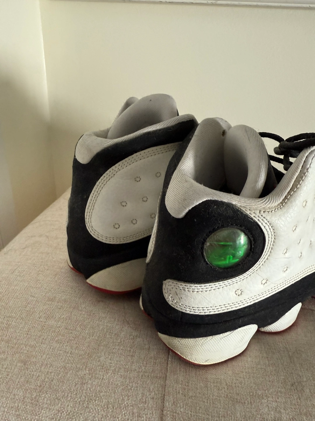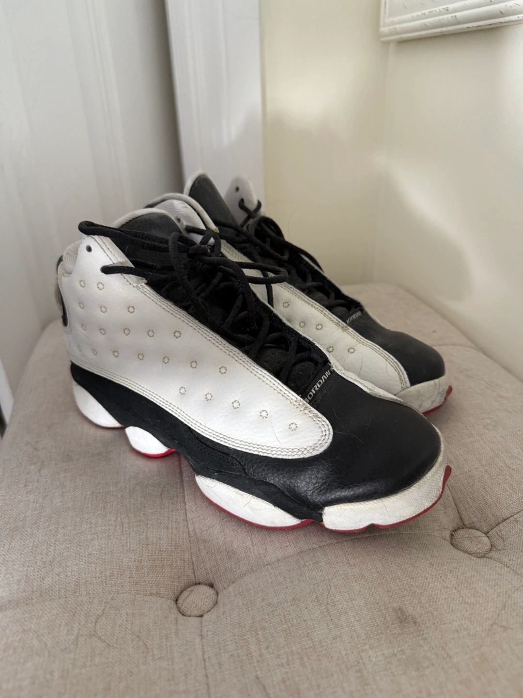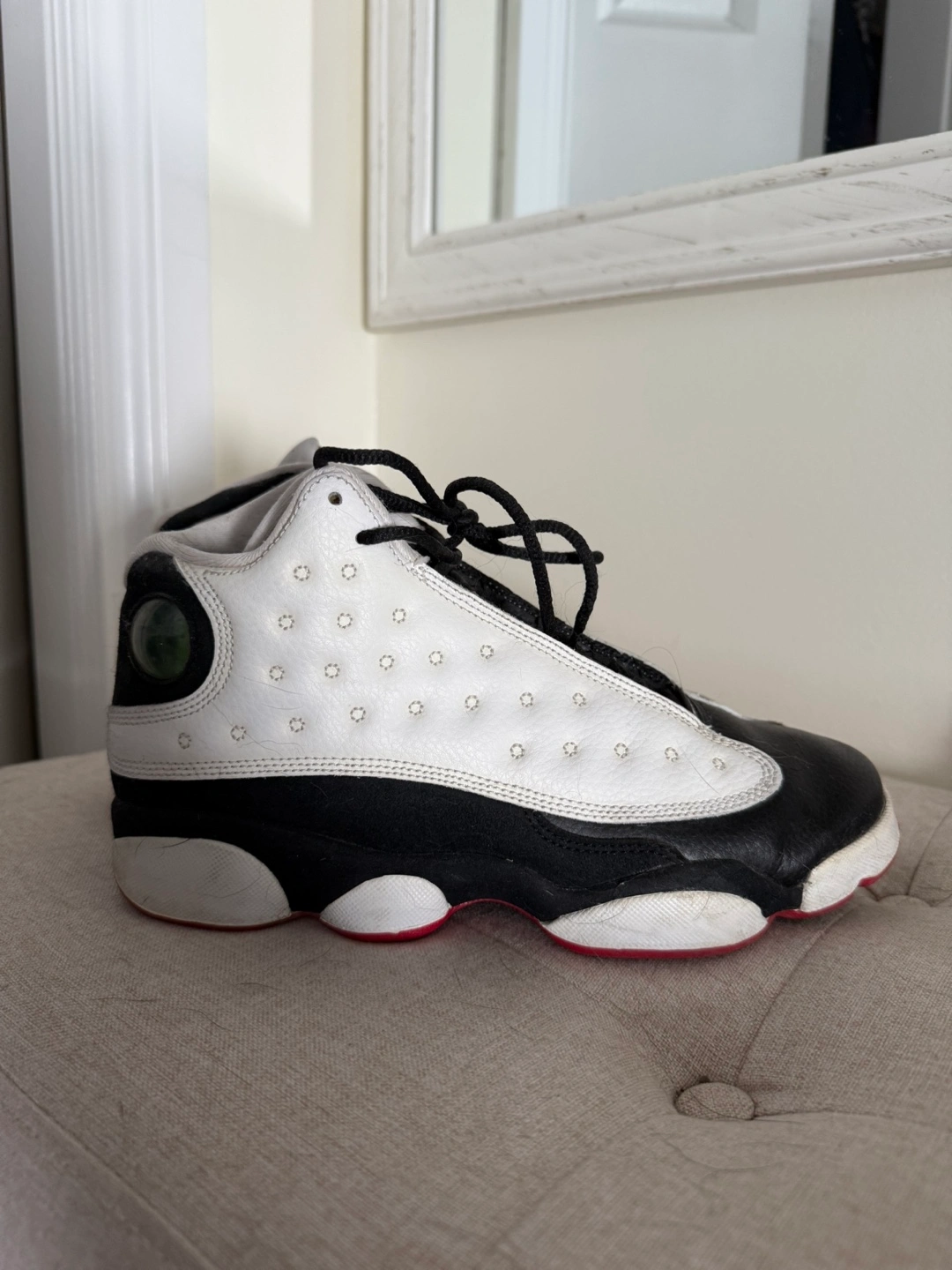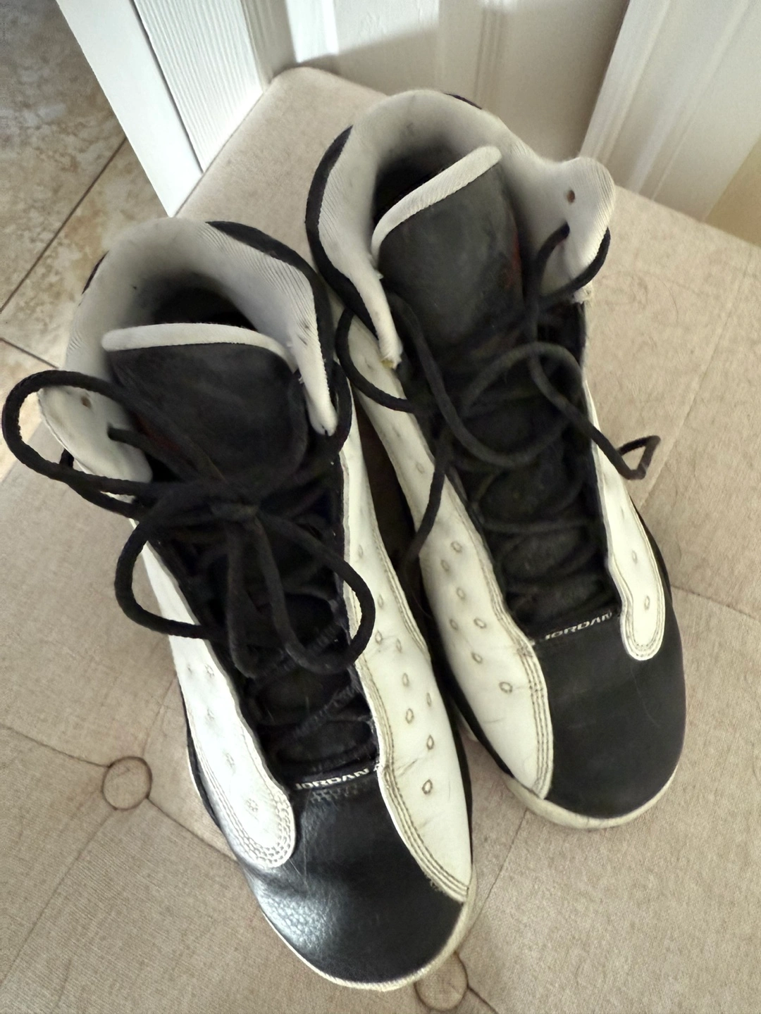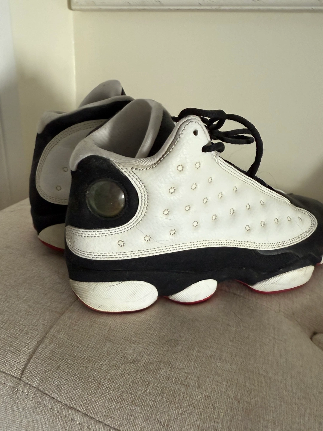 Pre-owned Air Jordan 13 Retro basketball shoes. Black and white colourway. Size 6Y. Show a little bit of creases by the front but overall in very good condition and have barely been worn. Great for a gift.