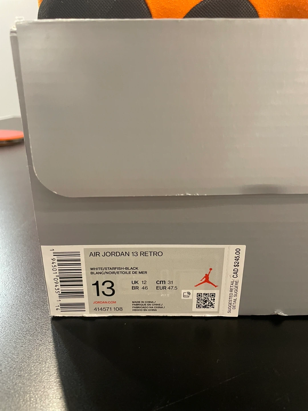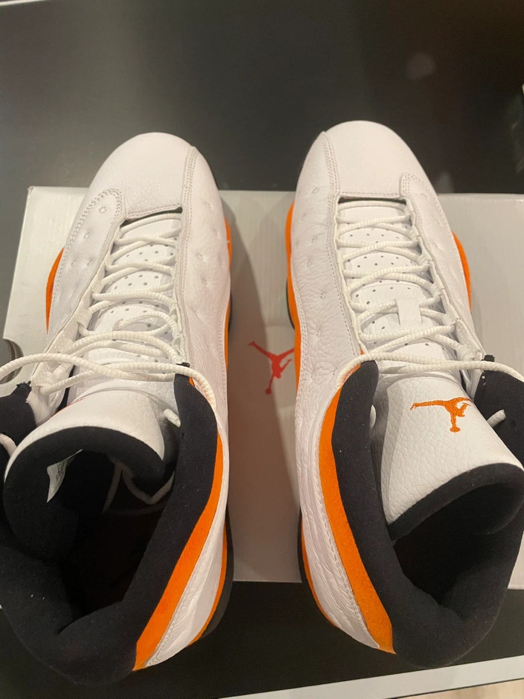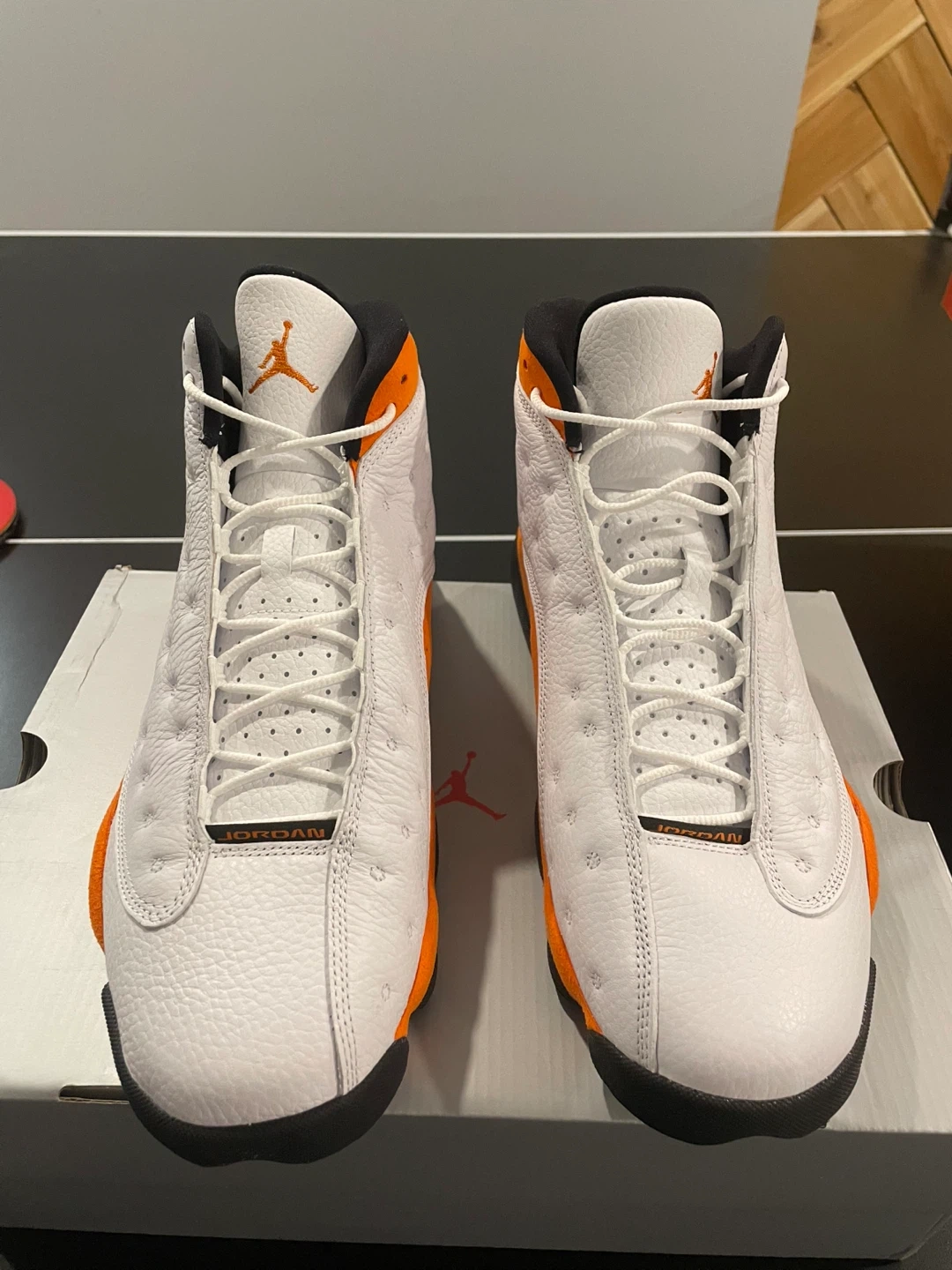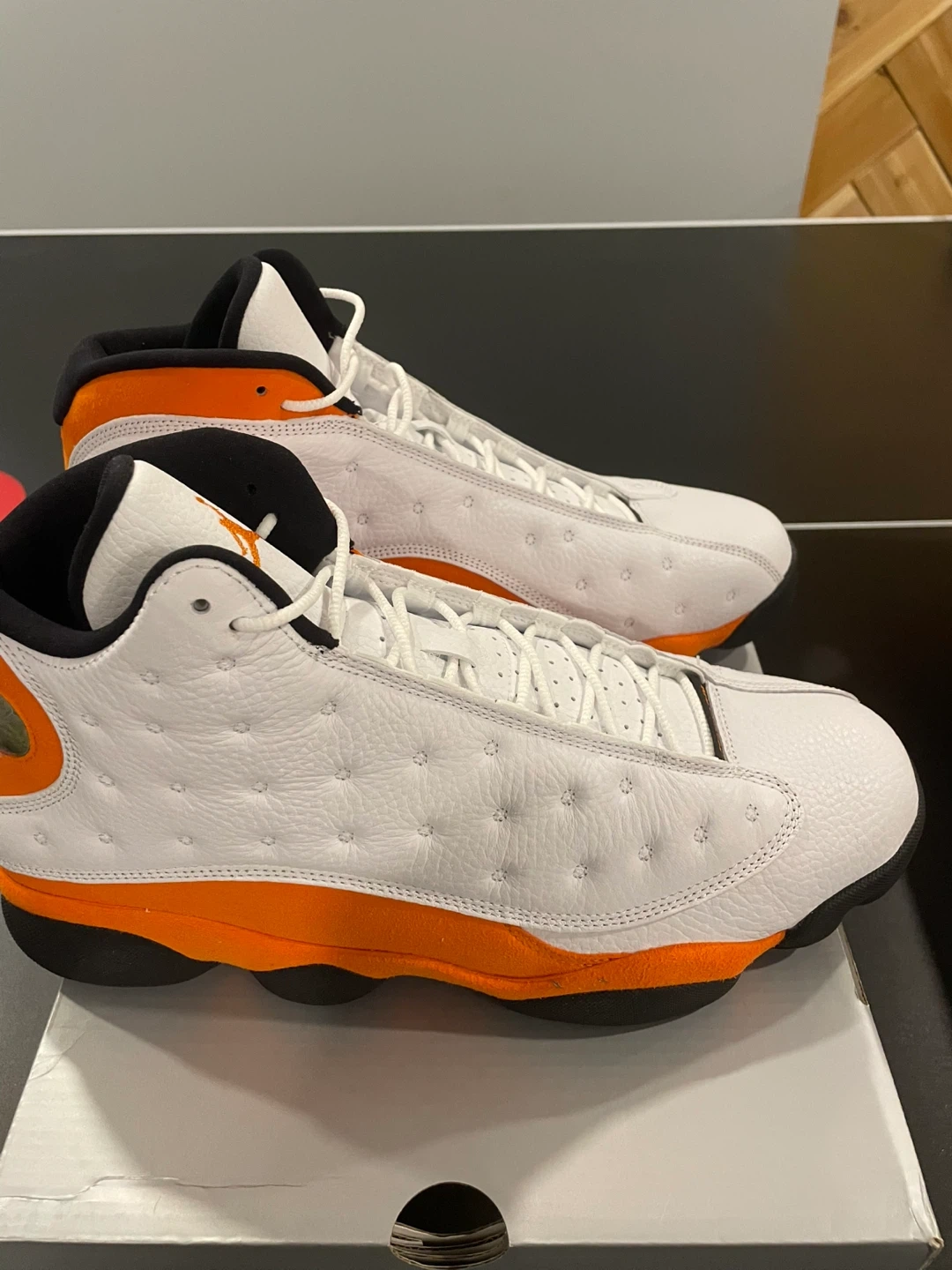 4Selling a pair of DS Air Jordan 13 Retro in white and starfish orange, size 13. Comes with the original box.