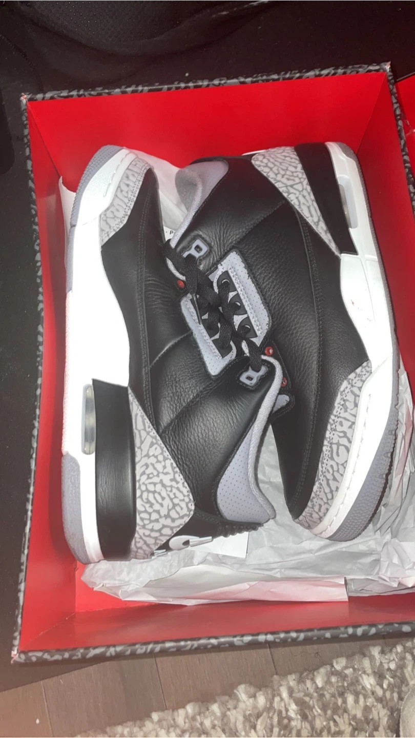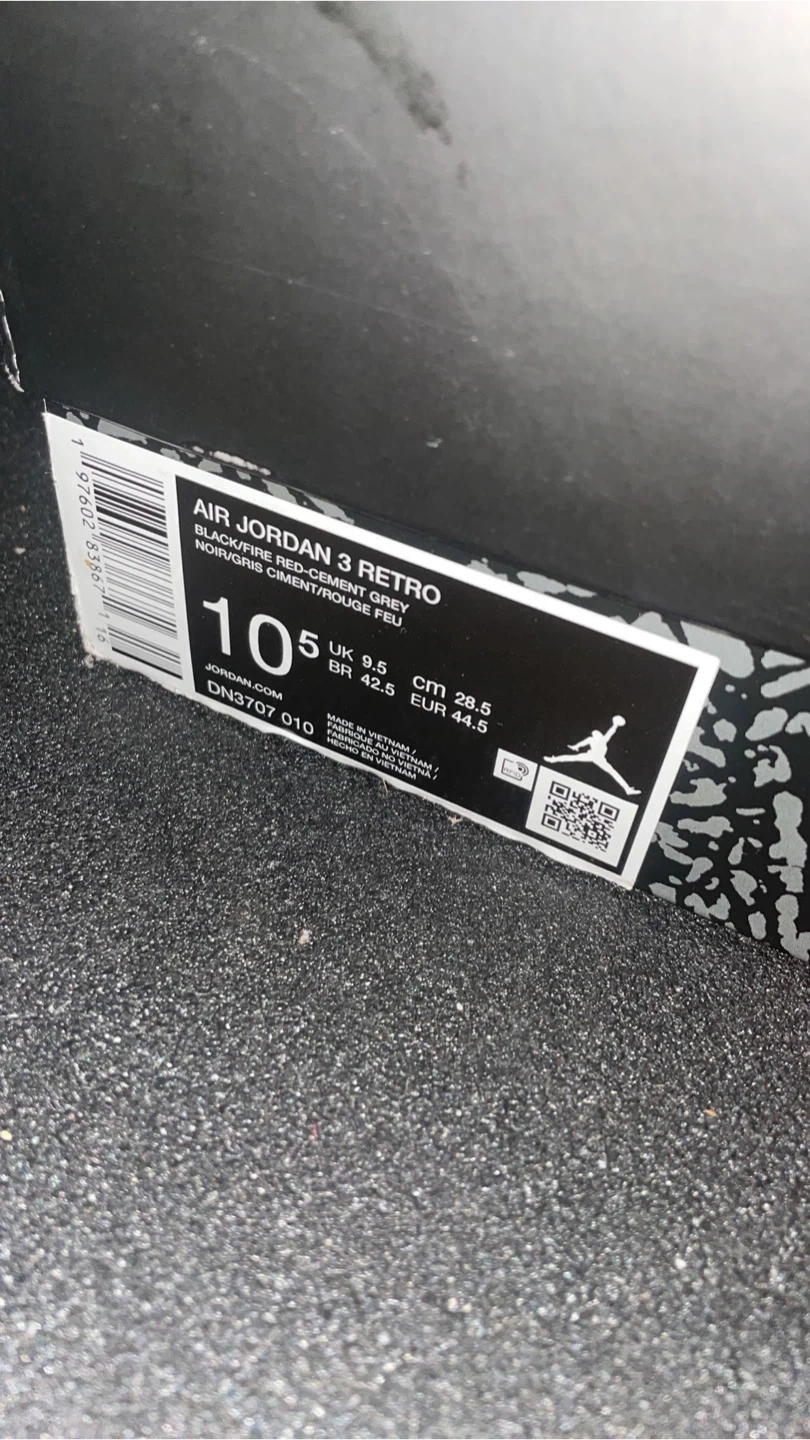 19Selling a pair of Air Jordan 3 Retro in black/fire red. These are a size 10.5 US. They come with the original box. Stylish and comfortable!