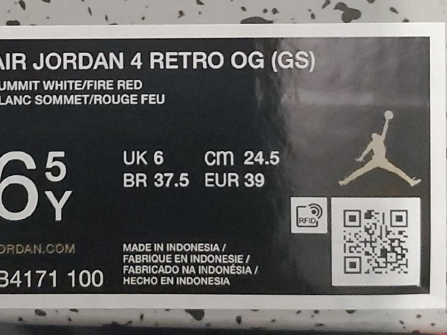 10Selling a pair of Air Jordan 4 Retro OG (GS) sneakers. Brand New, never worn. The size is 6.5Y, which corresponds to UK 6, CM 24.5, BR 37.5, and EUR 39