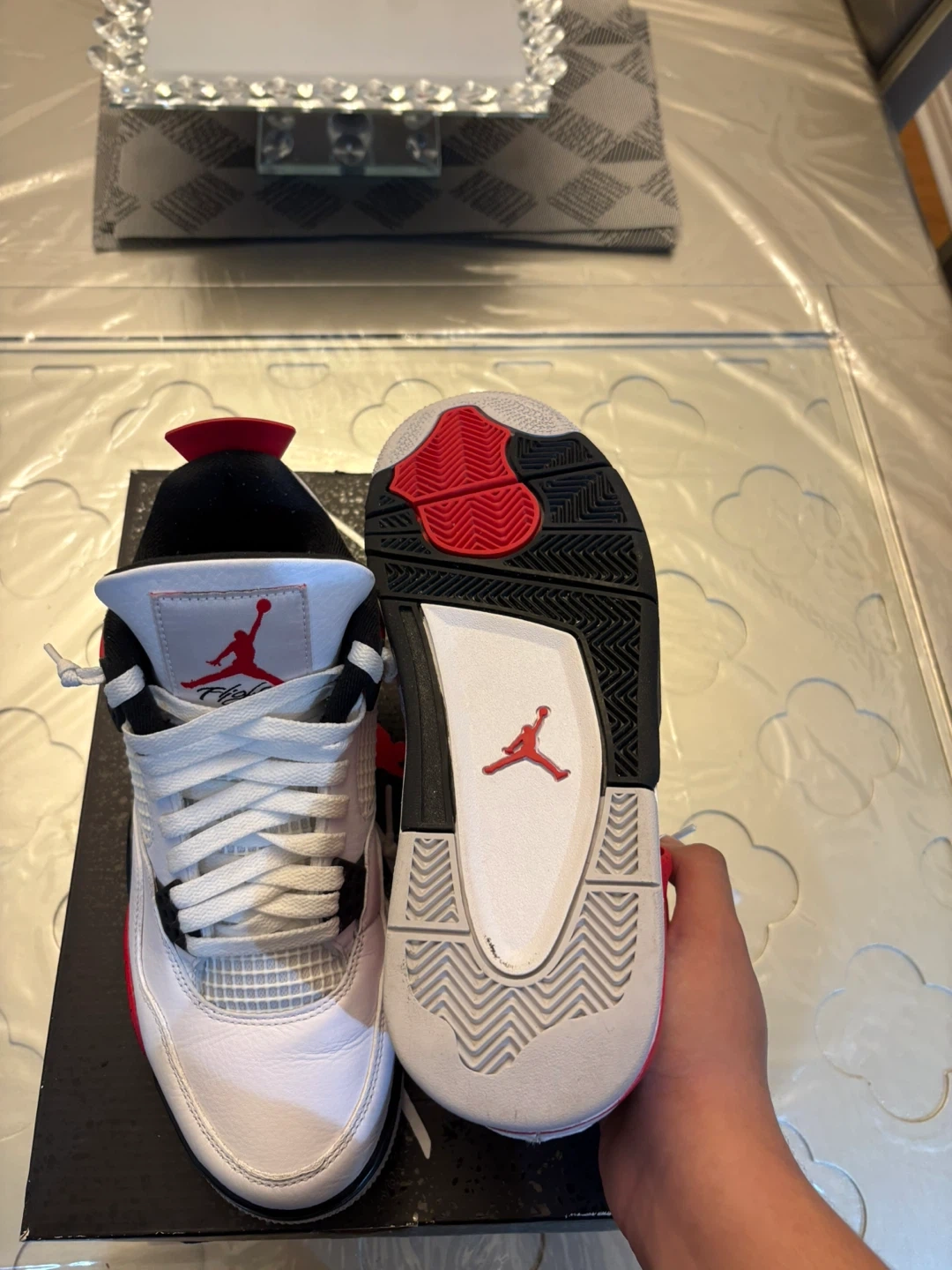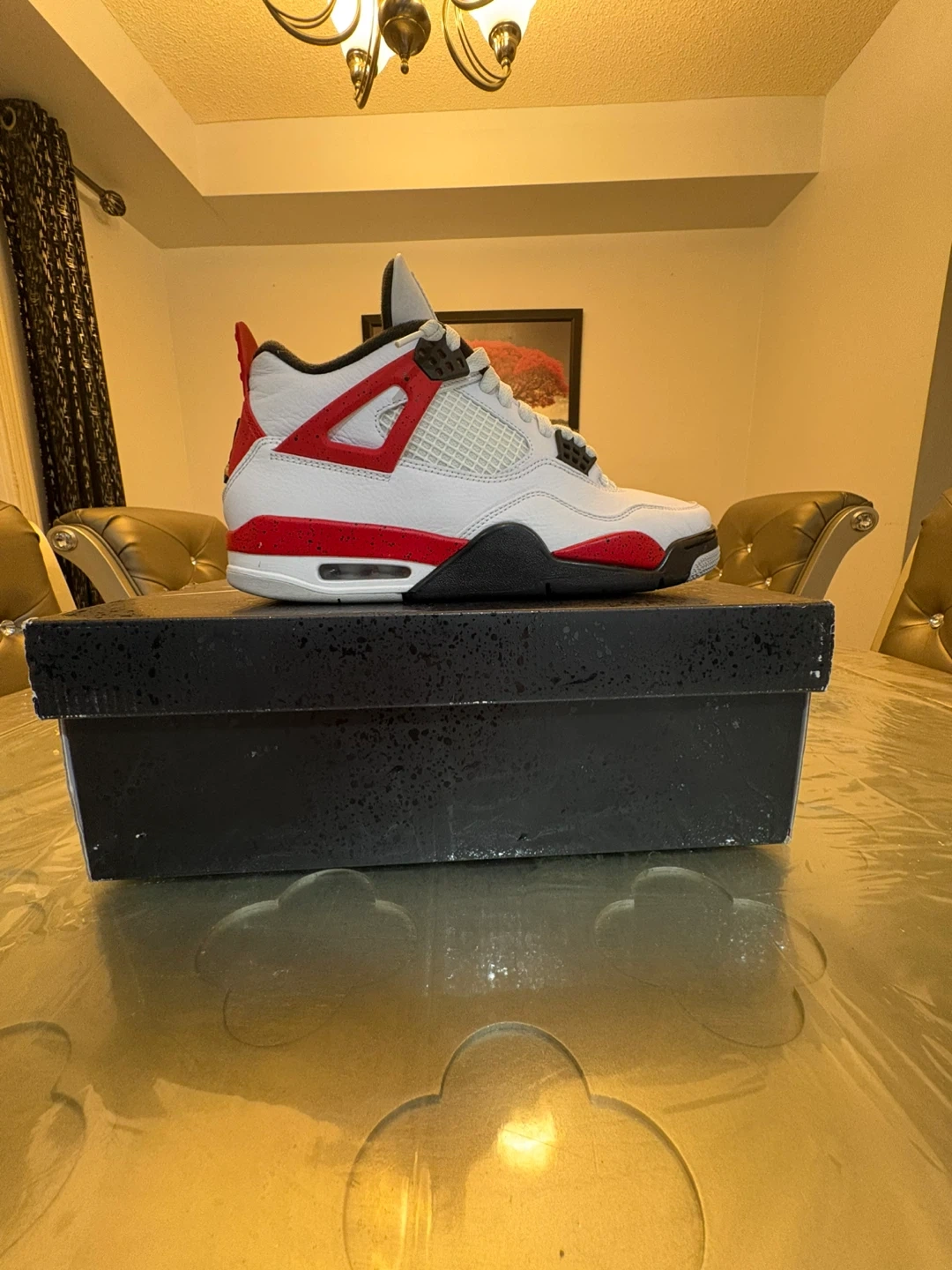 10Selling a pair of Air Jordan 4 Retro in the red cement colourway. They come with the original box. Great for any sneakerhead!
