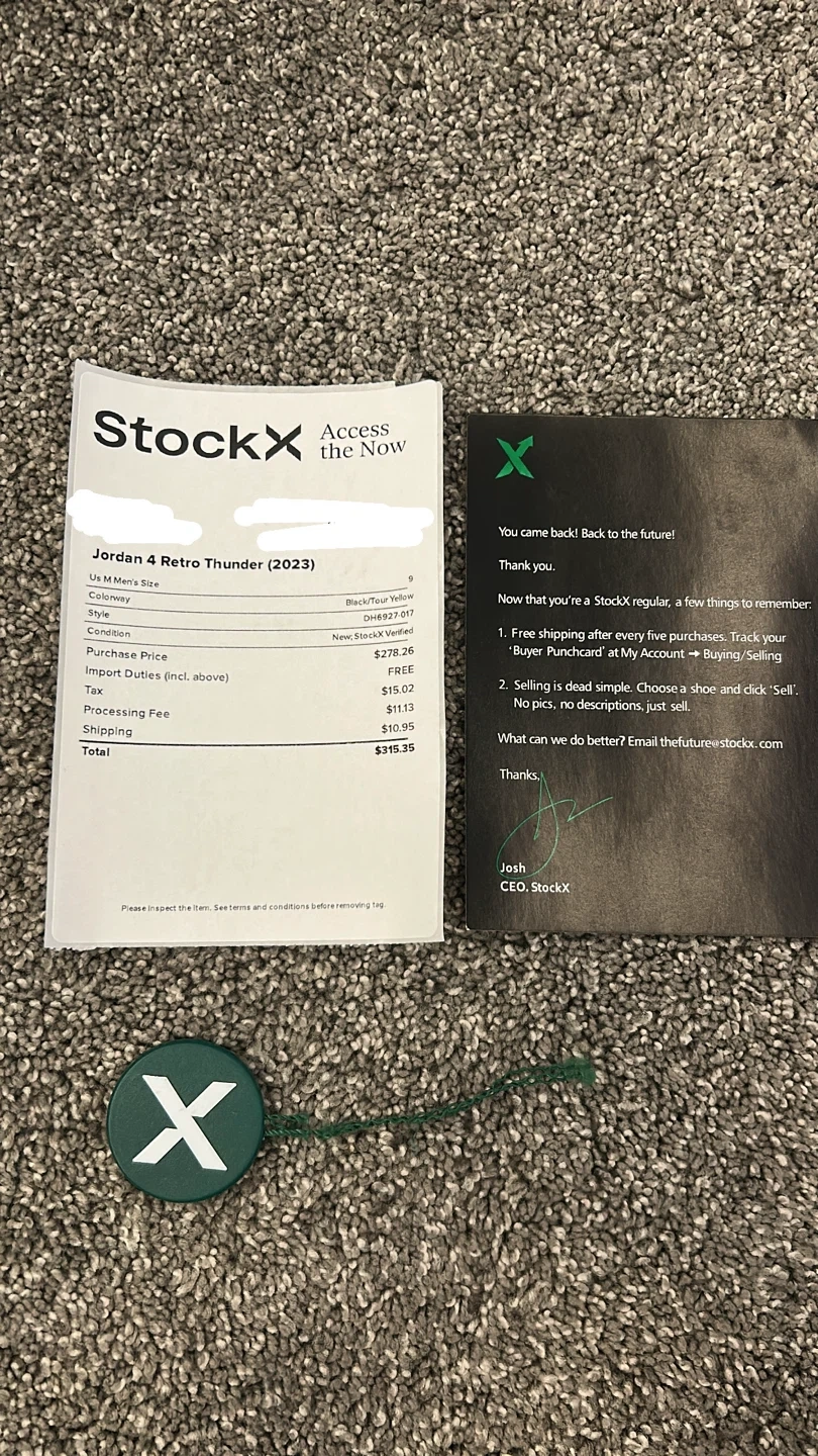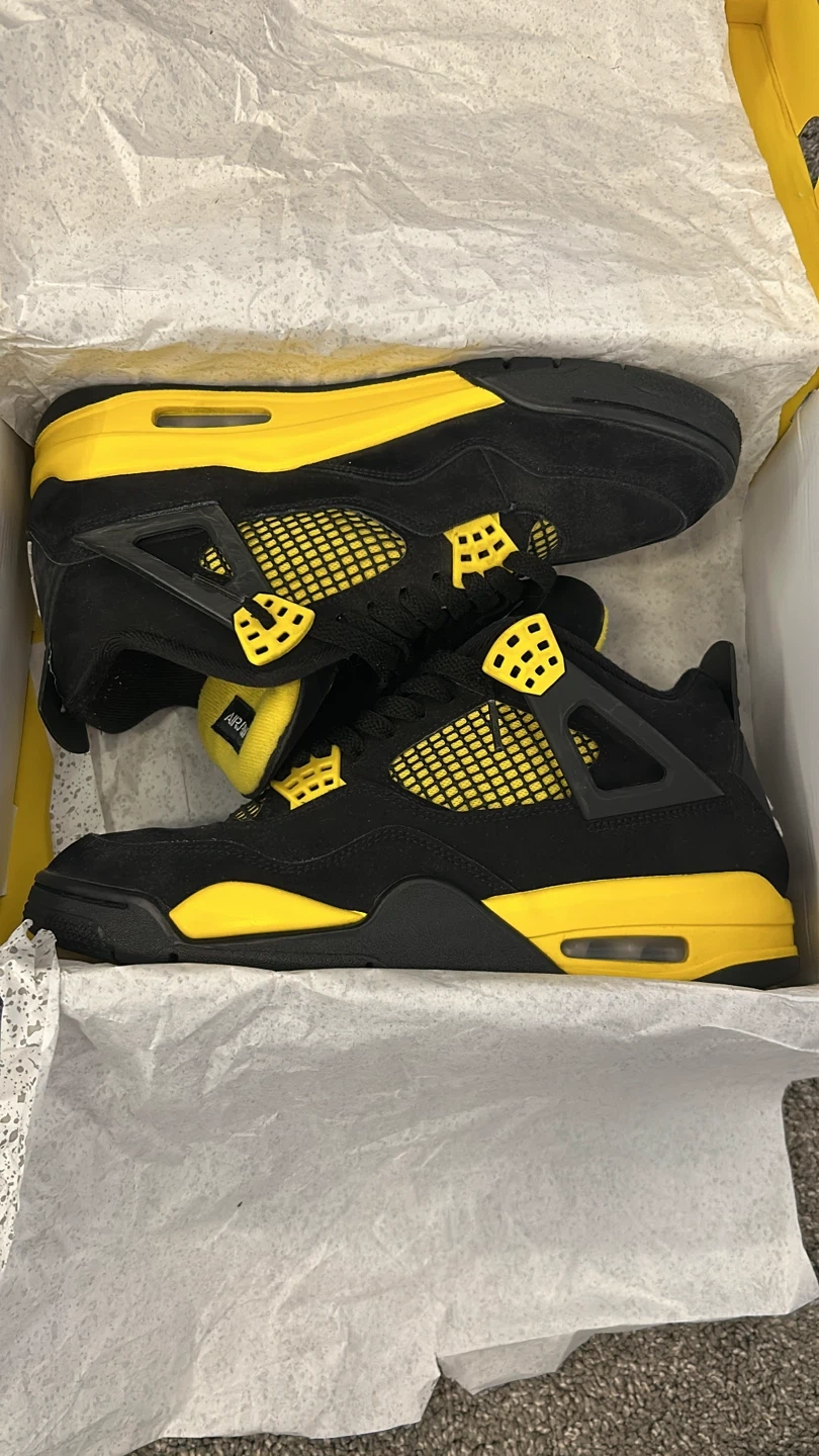 10Selling a pair of Air Jordan 4 Retro Thunder (2023) in men's size 10.5. The colour is Black/Tour Yellow. Comes with the box