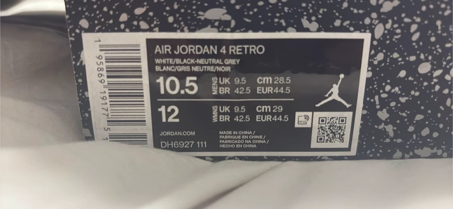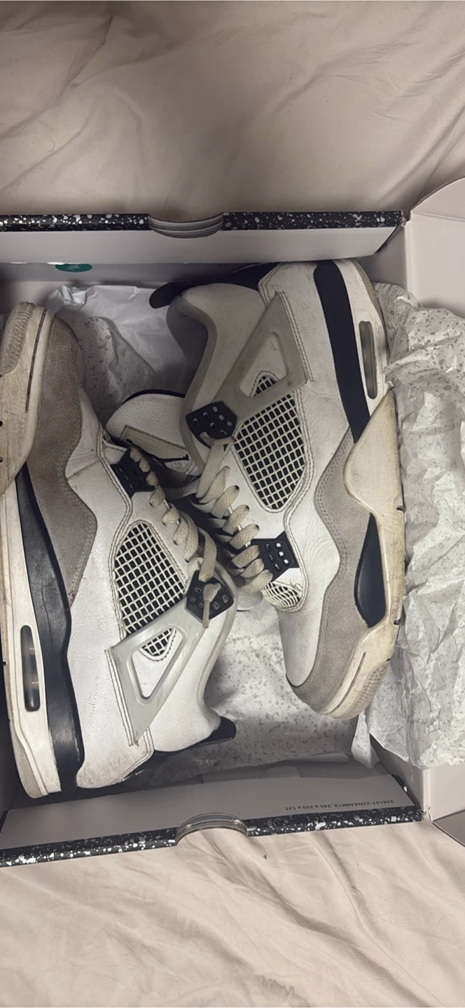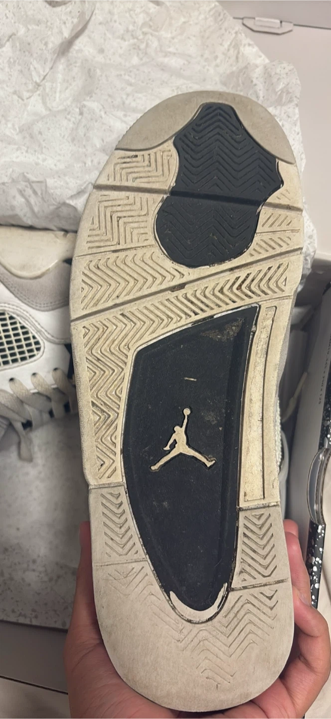 0Selling a pair of Air Jordan 4 Retro in white and black. They are size US 10.5 and come with the original box. Please see photos for condition, there are some signs of wear on the soles.