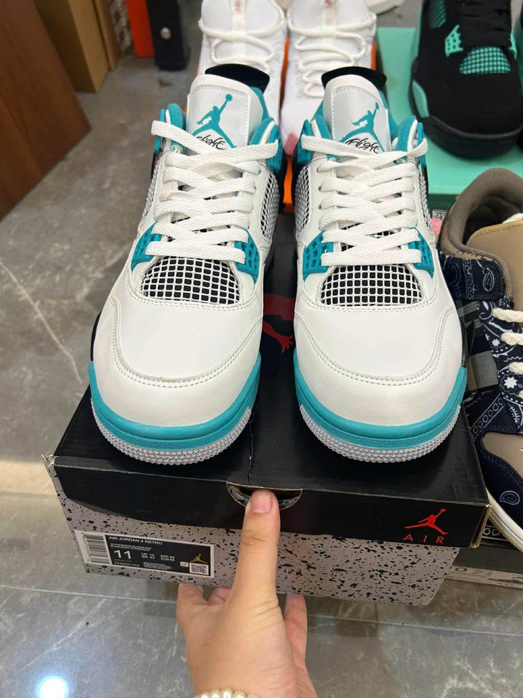 65Selling a pair of Air Jordan 4 Retro sneakers in white and teal. These are in great condition and come with the original box. The size is US 11. A stylish addition to any sneaker collection!