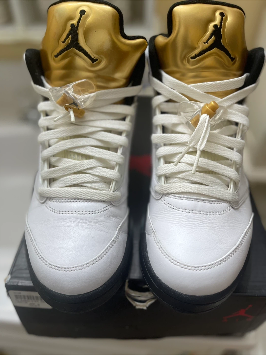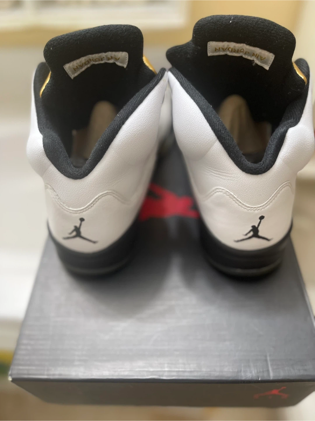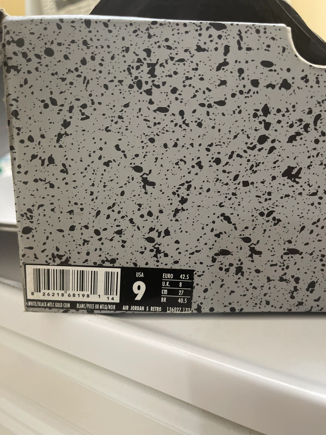 Selling a pair of Air Jordan 5 Retro sneakers in size 9. The colourway is White/Black/Gold. Comes with the original box!