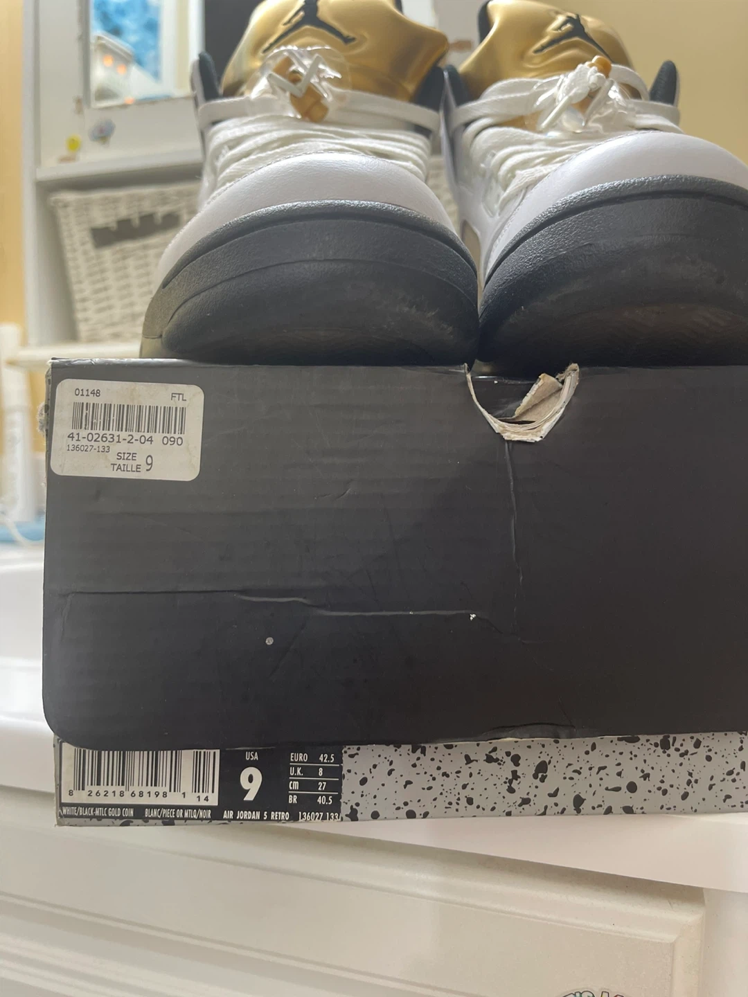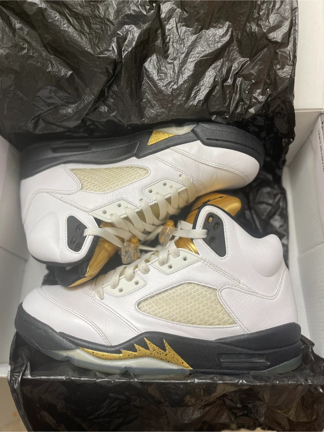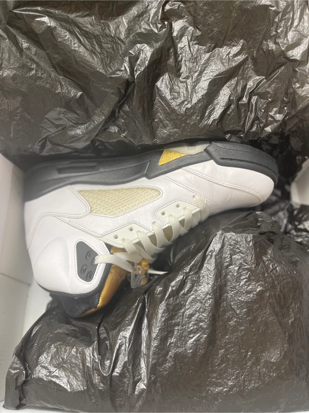Selling a pair of Air Jordan 5 Retro sneakers in size 9. The colourway is White/Black/Gold. Comes with the original box!