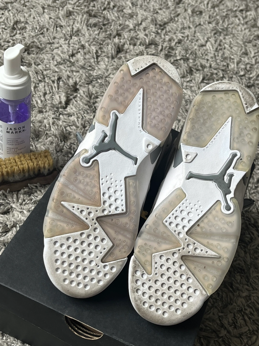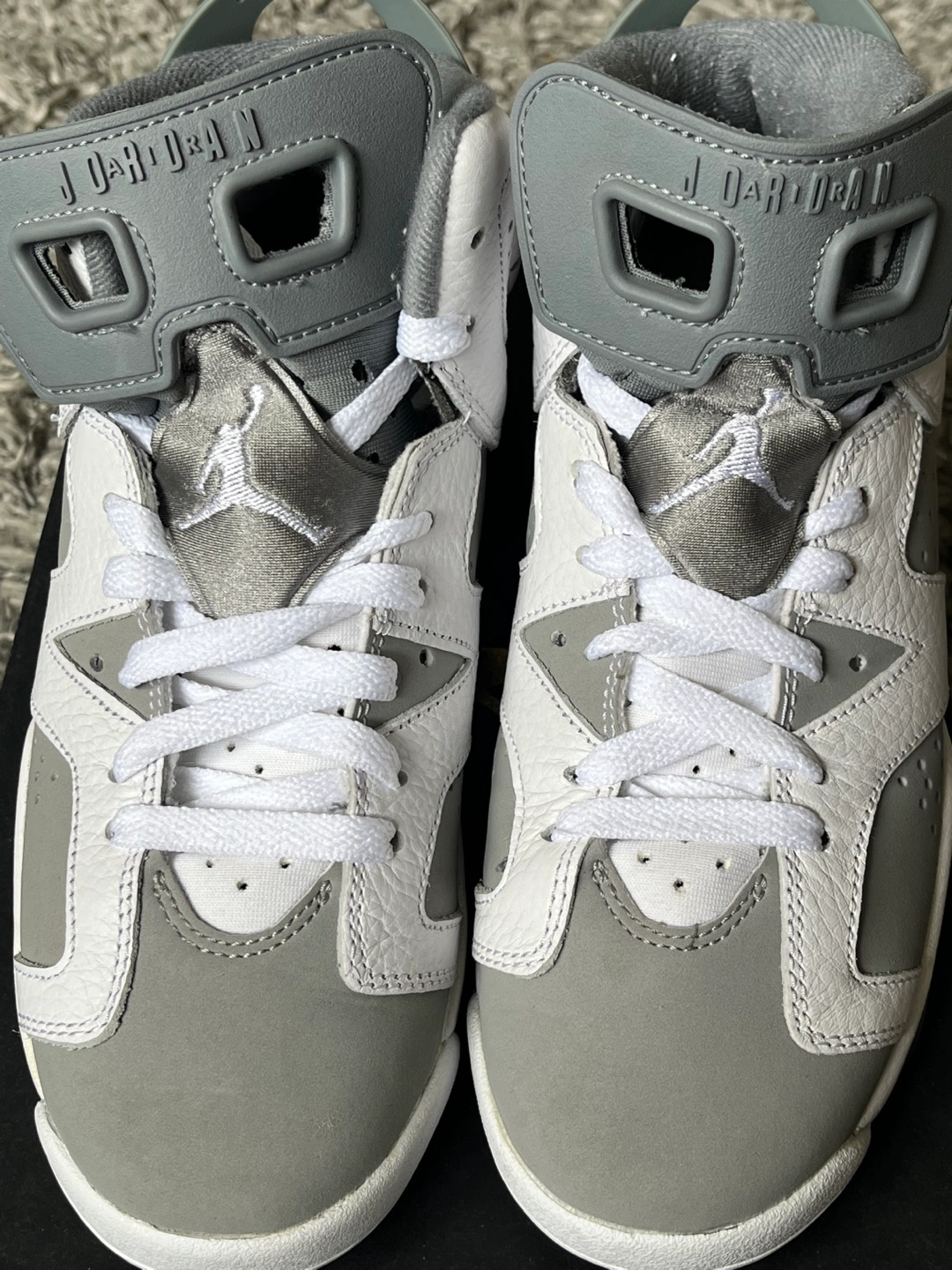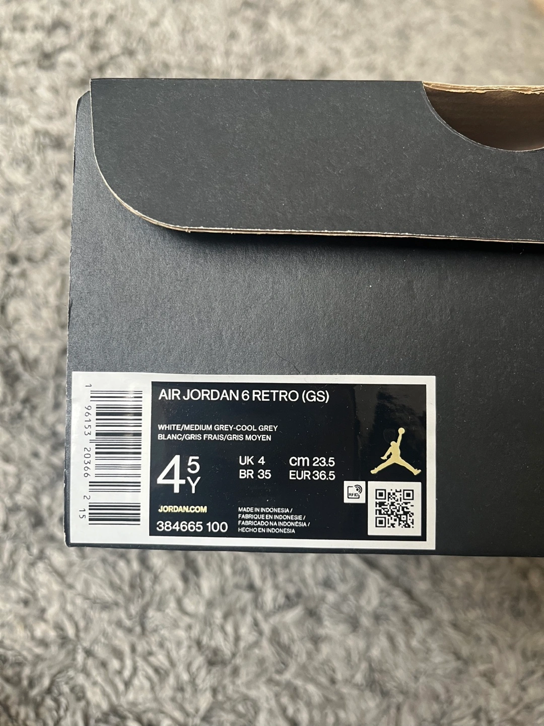 34Selling Air Jordan 6 Retros! Purchased Roughly 2022 or 2023. 🚨 PLEASE READ DETAILS BELOW 🚨 White/Medium-Grey/Cool Grey SKU: 384665-100 4.5Y (as in youth size) = Womens Size 6. Condition: 8.75/10 for these reasons - Very little creasing at the top (shown in photos) - Bottoms of the shoes, I’ve cleaned to the best of my ability with the Jason Markk Shoe Cleaner. (shown as the last picture) - A bit of discolouration on the clear rubber located on the outer perimeter of the shoes. A little more on the right than left. (also shown) ‼️I did wear it a couple of times indoors. But overall the top and inside of the shoes + the laces have been kept pristine! ☺️