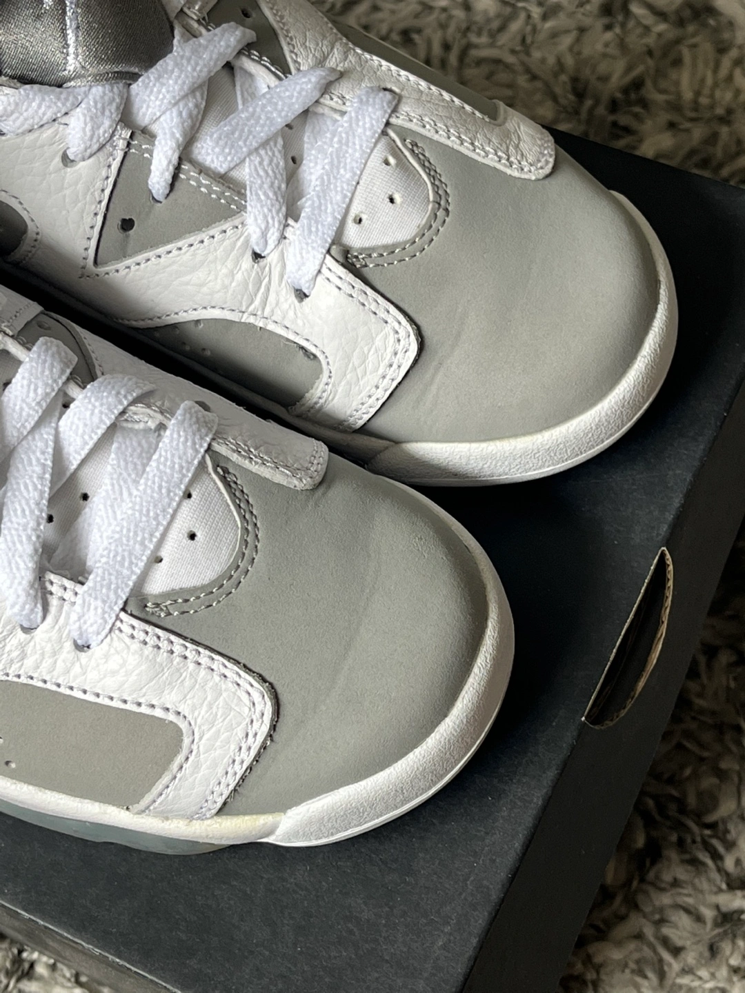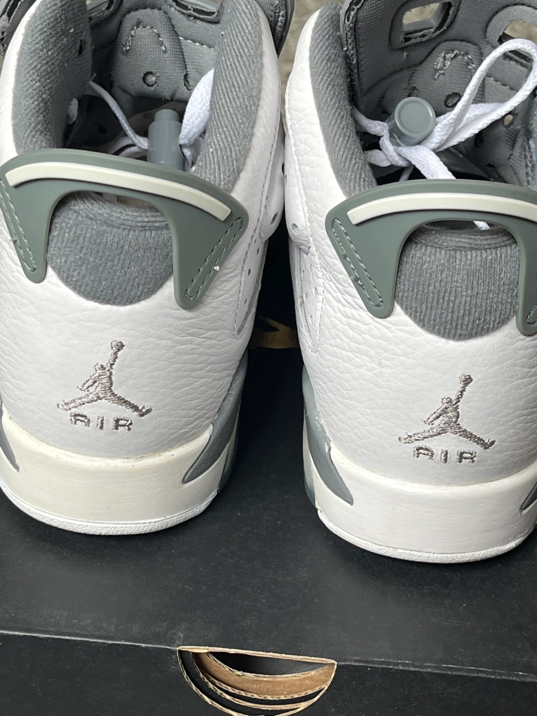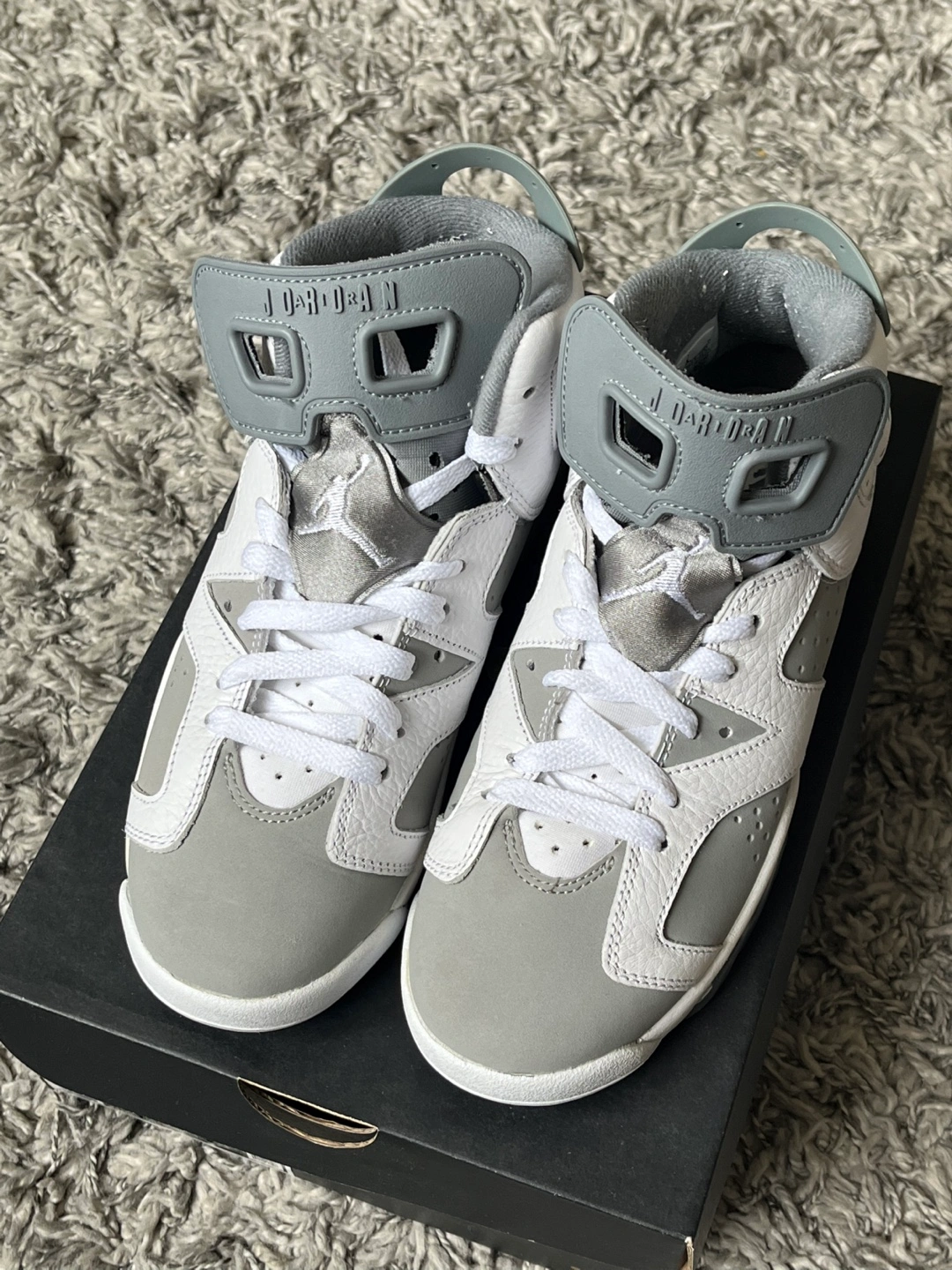34Selling Air Jordan 6 Retros! Purchased Roughly 2022 or 2023. 🚨 PLEASE READ DETAILS BELOW 🚨 White/Medium-Grey/Cool Grey SKU: 384665-100 4.5Y (as in youth size) = Womens Size 6. Condition: 8.75/10 for these reasons - Very little creasing at the top (shown in photos) - Bottoms of the shoes, I’ve cleaned to the best of my ability with the Jason Markk Shoe Cleaner. (shown as the last picture) - A bit of discolouration on the clear rubber located on the outer perimeter of the shoes. A little more on the right than left. (also shown) ‼️I did wear it a couple of times indoors. But overall the top and inside of the shoes + the laces have been kept pristine! ☺️