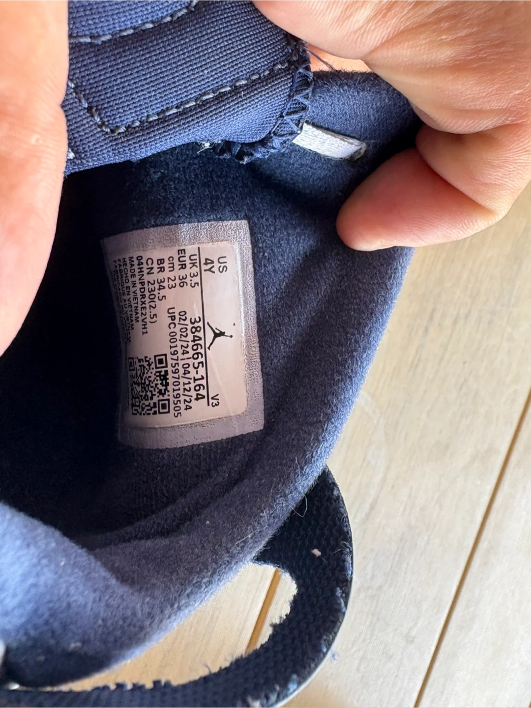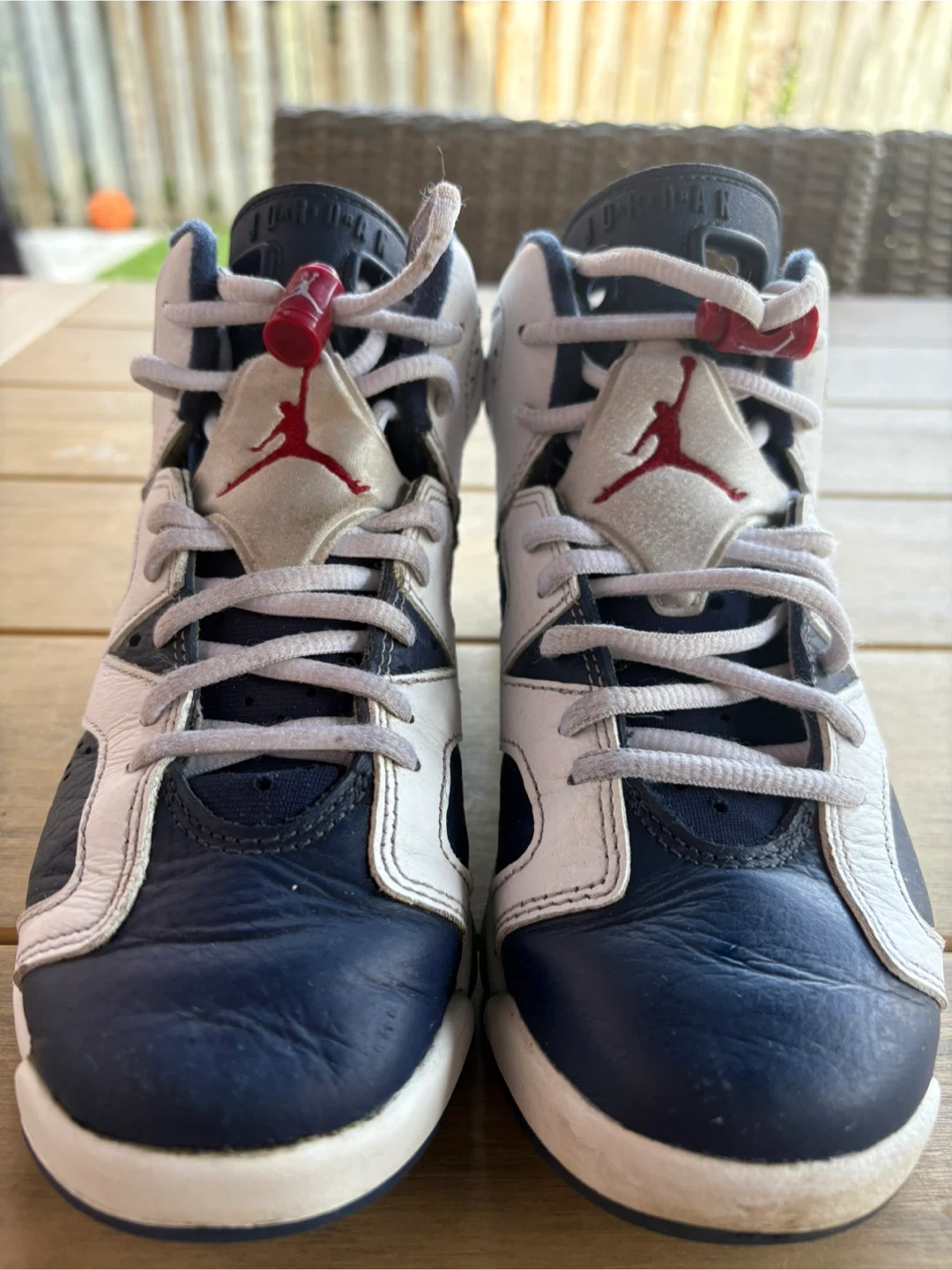 Selling a pair of Air Jordan 6 Retro sneakers in youth size 4. These stylish kicks feature a white and navy blue colourway with the iconic Jumpman logo in red. They are in good condition and ready for a new home!