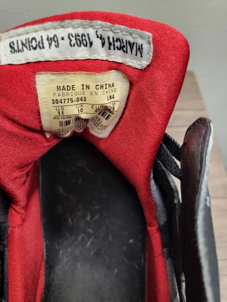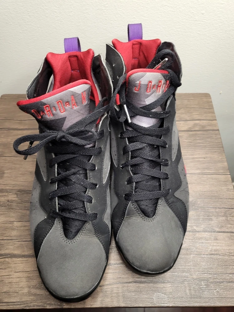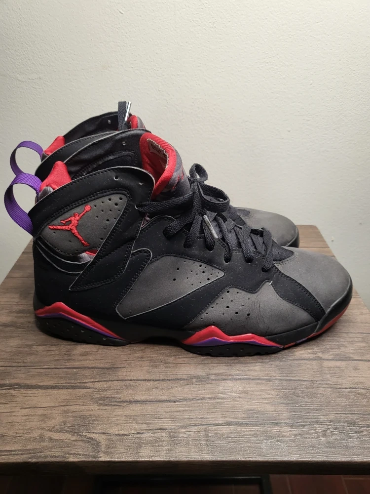 21Selling a pair of Air Jordan 7 Retro in the Raptors colourway, size 10 US. These sneakers feature a mix of black, grey, red, and purple accents. The manufacturing date is 2009 March 10. They're in good condition with some signs of wear.