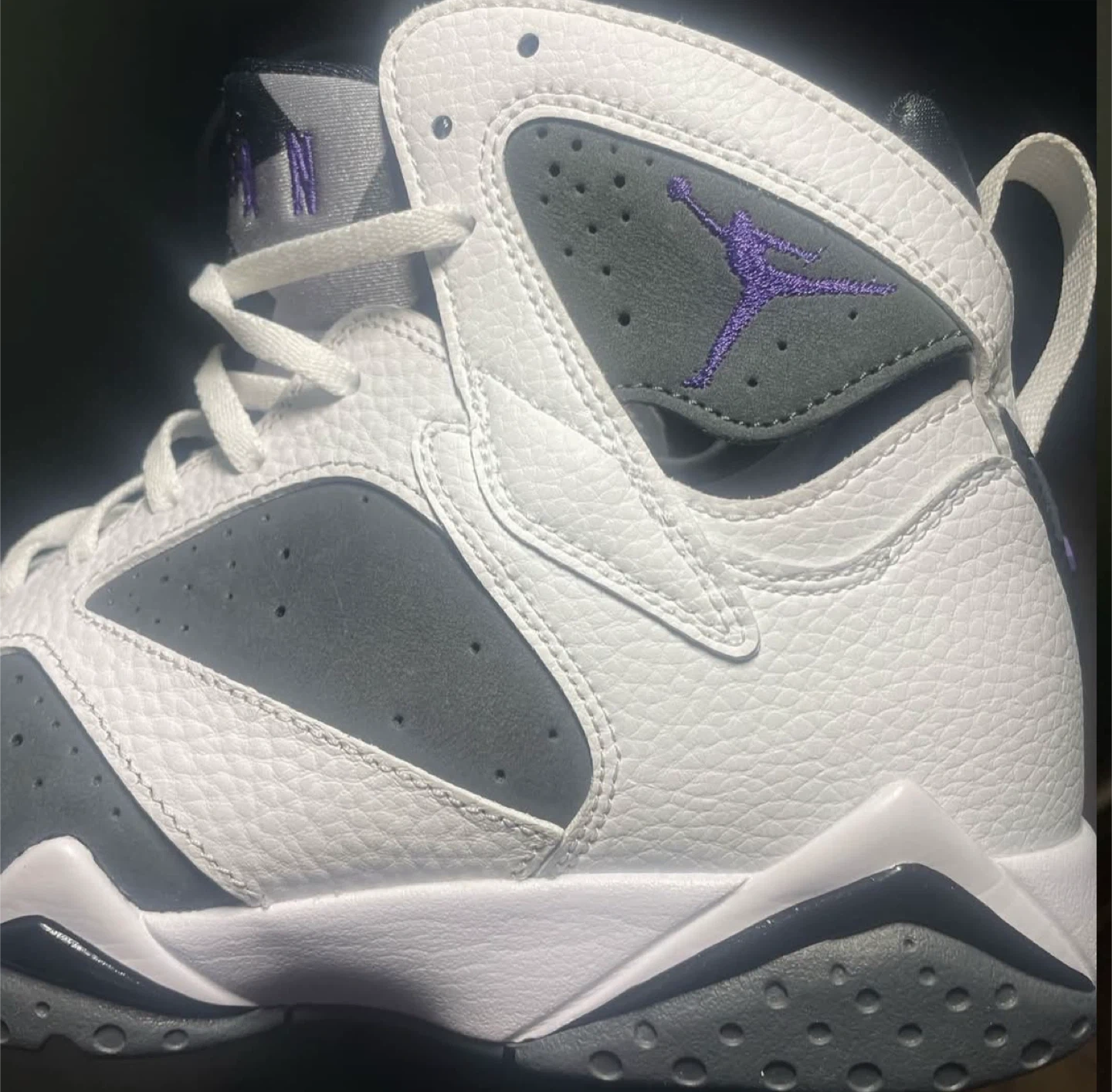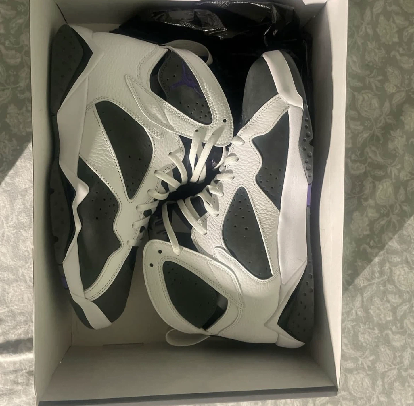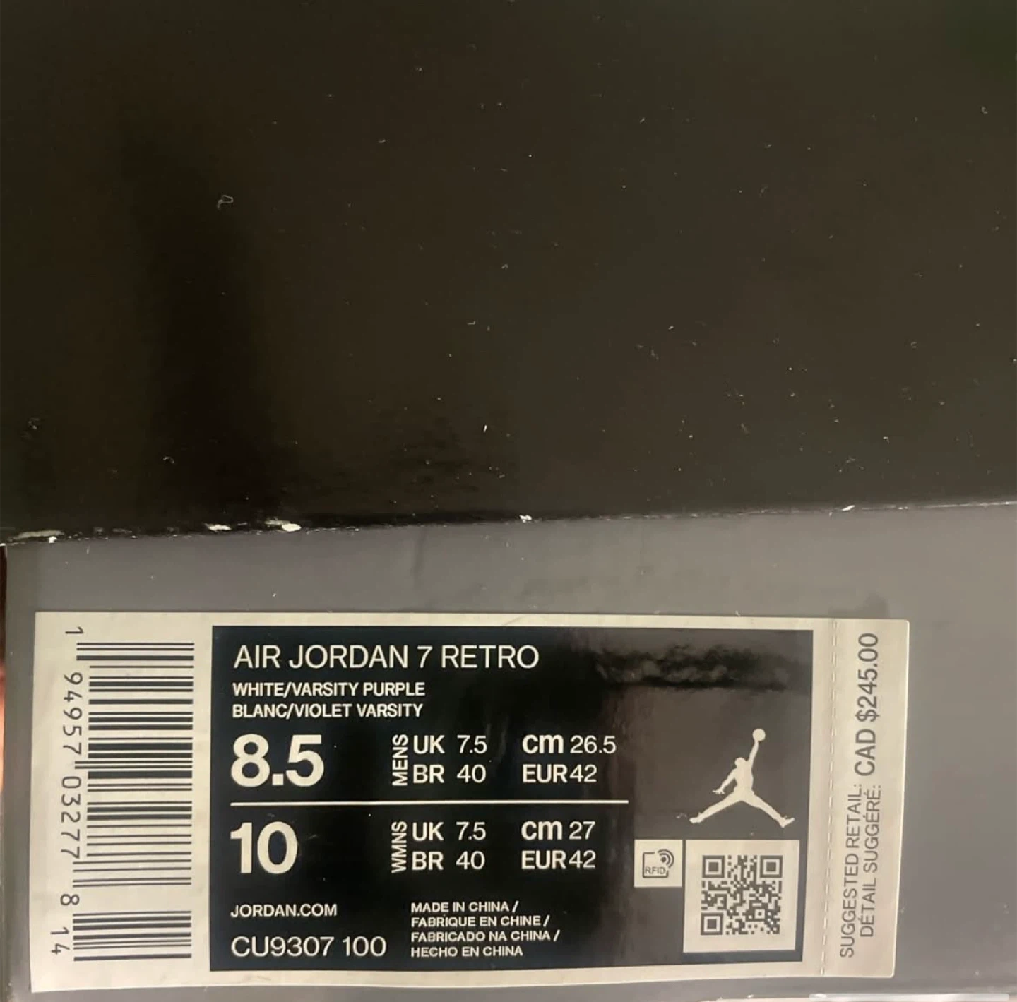 Selling a pair of Air Jordan 7 Retro in white and varsity purple. The size is US 8.5. They come with the original box!