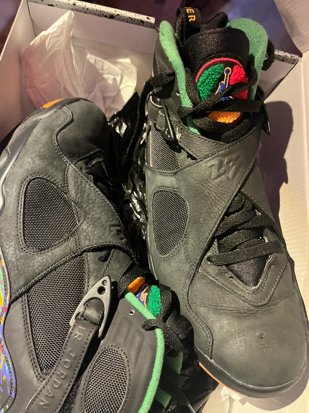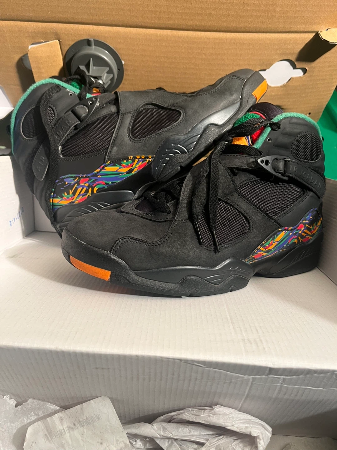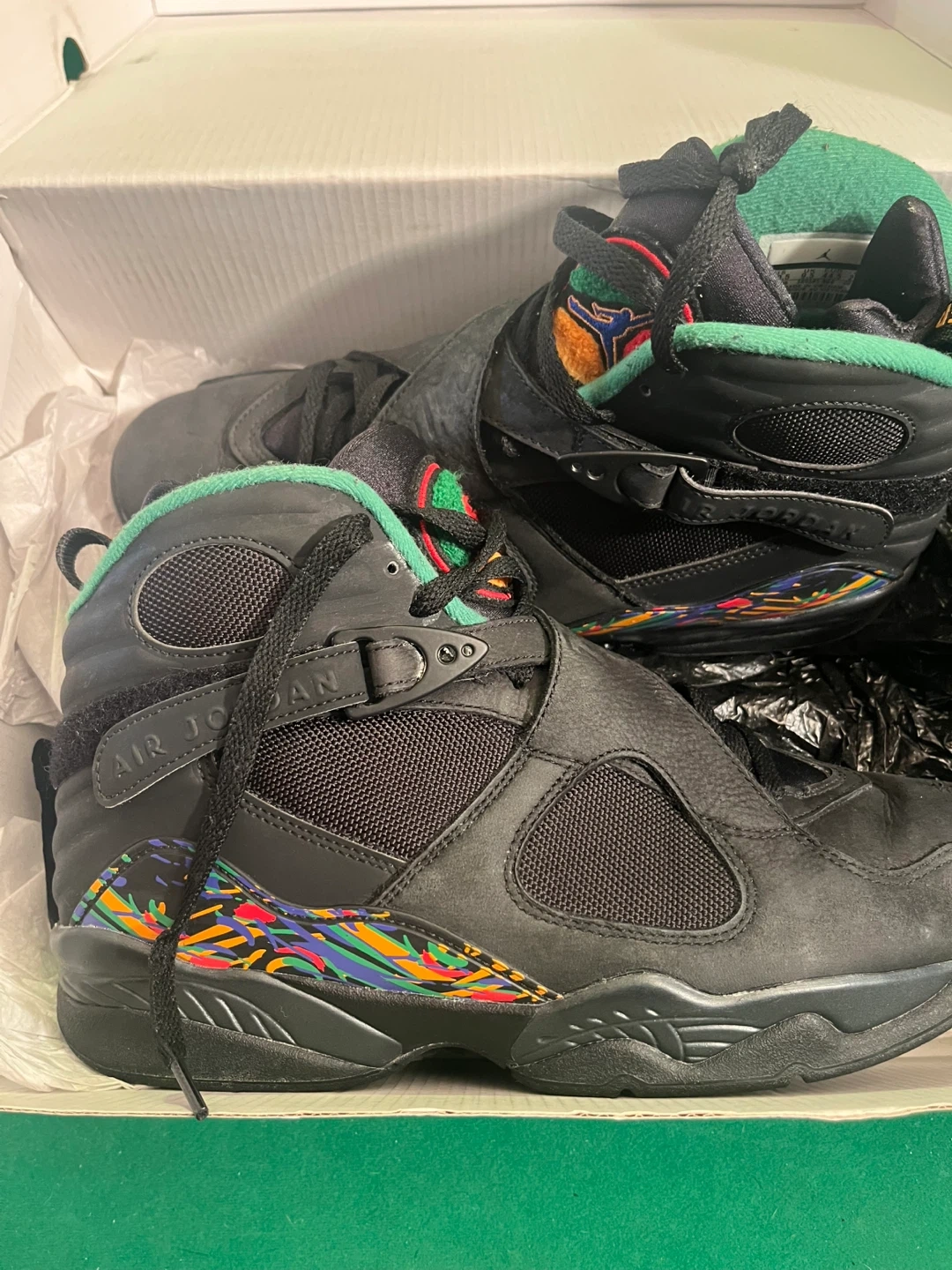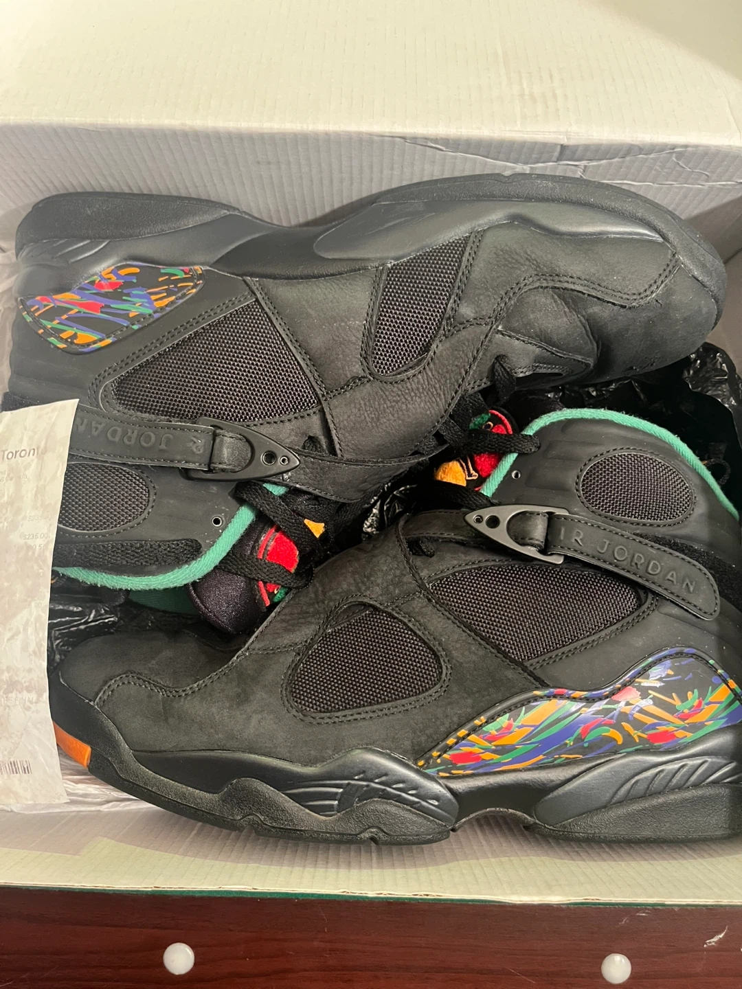 388Selling a pair of Air Jordan 8 Retro sneakers in black with multicolor accents. These are in great condition not the original box. Willing to trade