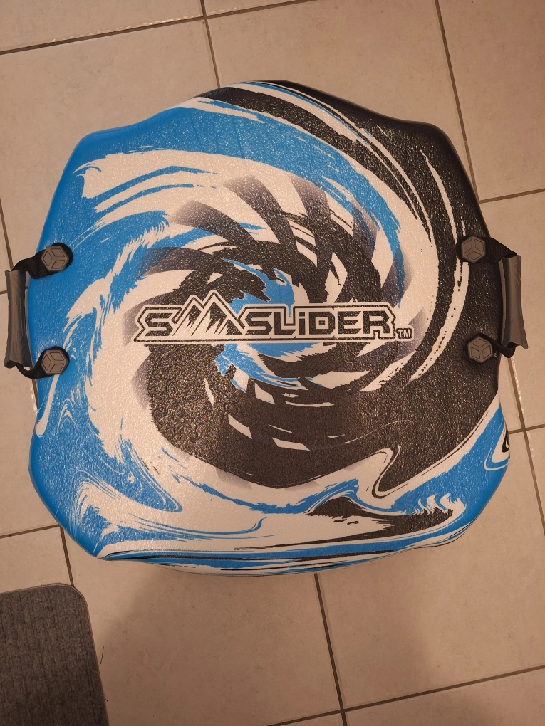 Get ready for some winter fun with this Air Slider snow sled! It features a cool blue, black, and white swirl design and sturdy handles for a secure grip. Perfect for kids and adults alike for some snowy adventures