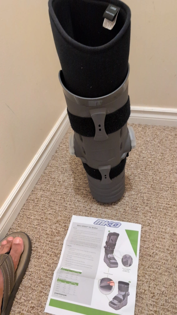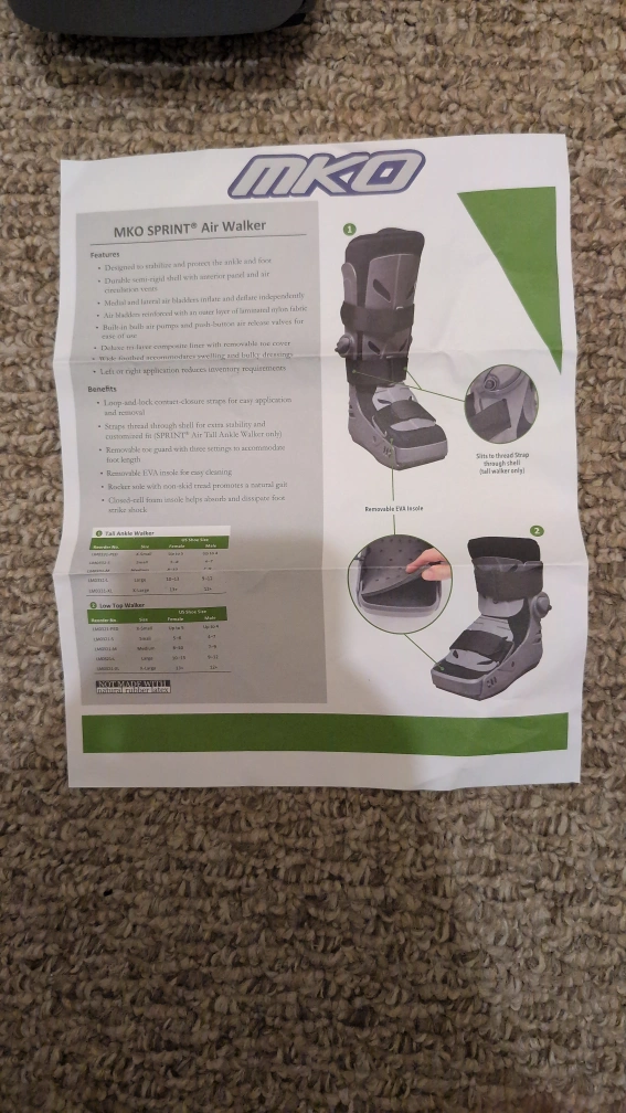MKO Sprint Air Walker boot in size large. It's designed to stabilize and protect the ankle and foot. The durable, lightweight shell has a low rocker for natural gait. Air bladders inflate and deflate independently. It has a removable EVA insole for easy cleaning. you used it only 4 days. the hospital charged me $220 for that. it is for the right foot