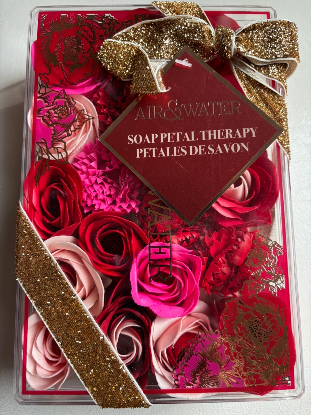 Box of soap petals. Assorted colours. Gold ribbon accents. Great gift.