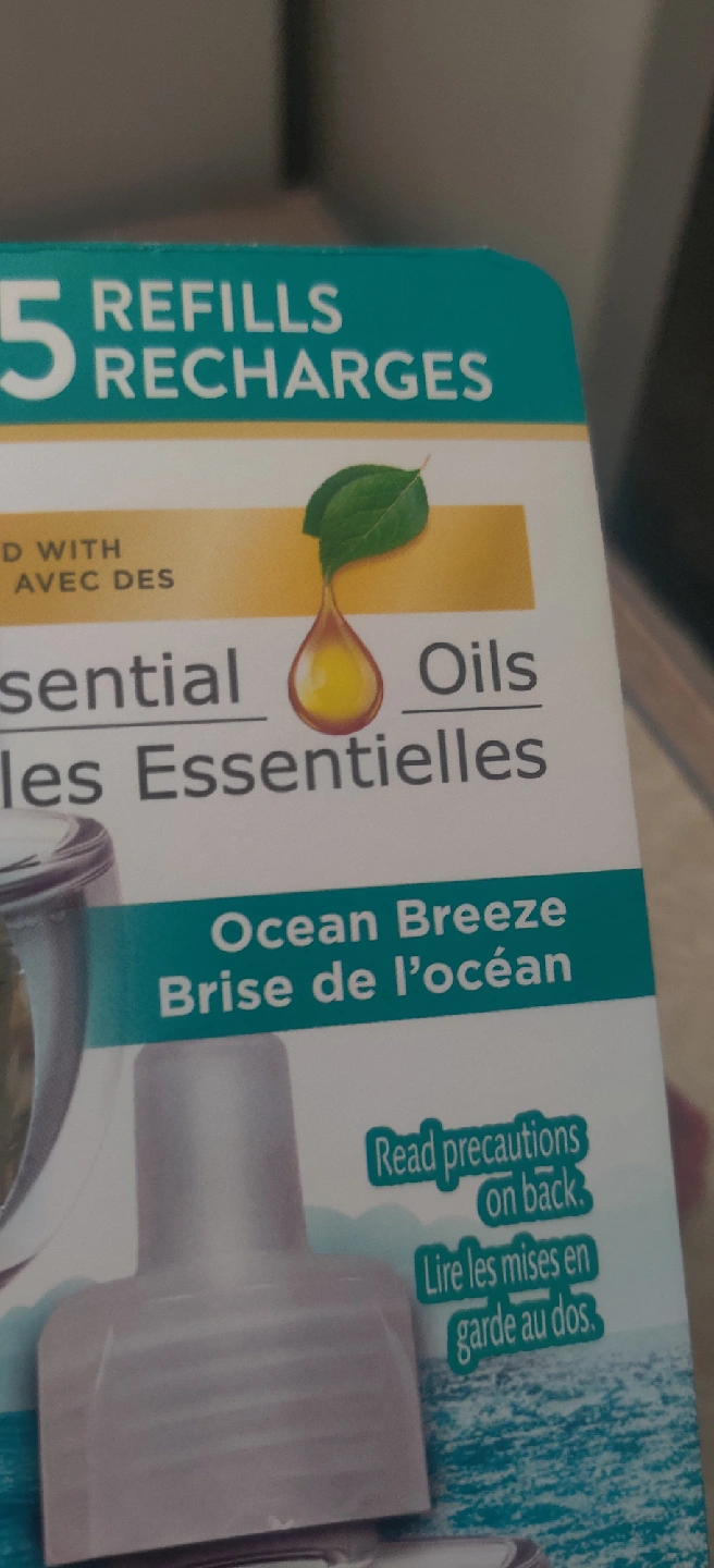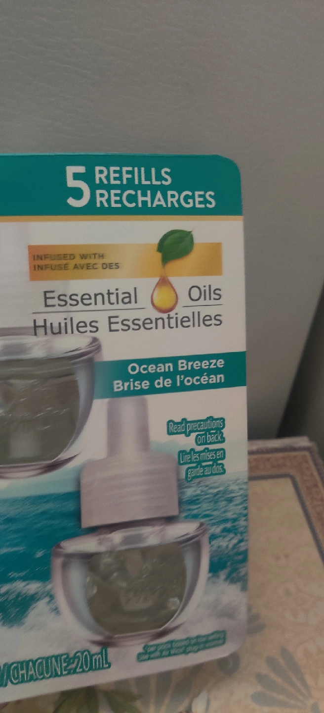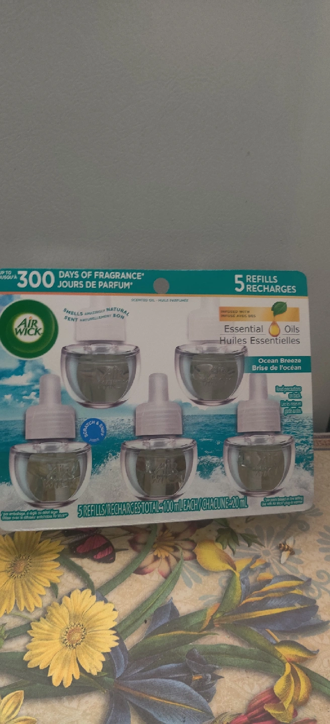 Selling a pack of Air Wick scented oil refills in the Ocean Breeze scent. There are 5 refills included, each containing 20ml. Enjoy up to 300 days of fragrance with these refills!