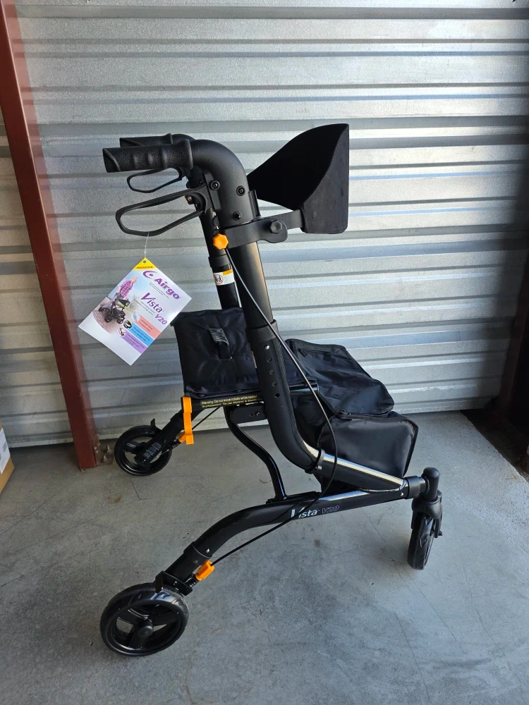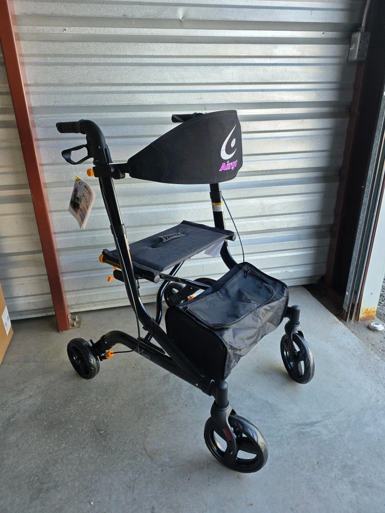 34Brand new either in box or already assembled 20" rollator. Comes with a receipt and a one year warranty. Features a lightweight aluminum frame with pop-in legs, making it an ideal travel companion Easy to fold by pull of a strap, locks folded, and stands when folded Locks in both open and closed position for safety Padded seat and contoured backrest for comfort Extra-large soft basket with a secure cover, that folds with the frame Ergonomic handgrips fit naturally for easier brake access Brakes lock for security when seated, and feature tool-free adjustment Wheels positioned outside the handles for better stability Treaded 8” front wheels for superior steering and rolling comfort Call Danny to order your New Rollator today! 647-575-2972
