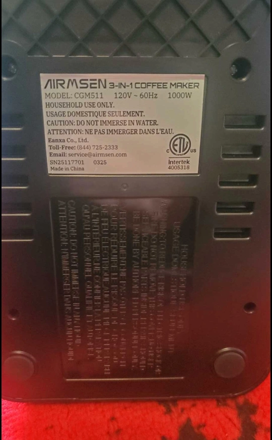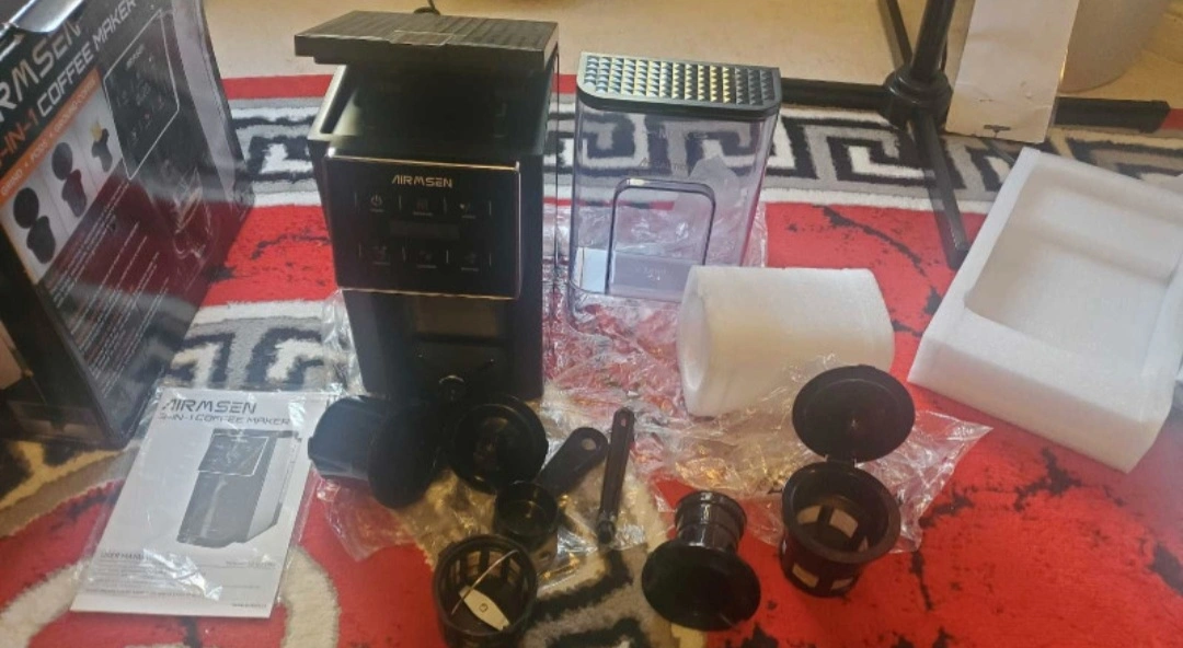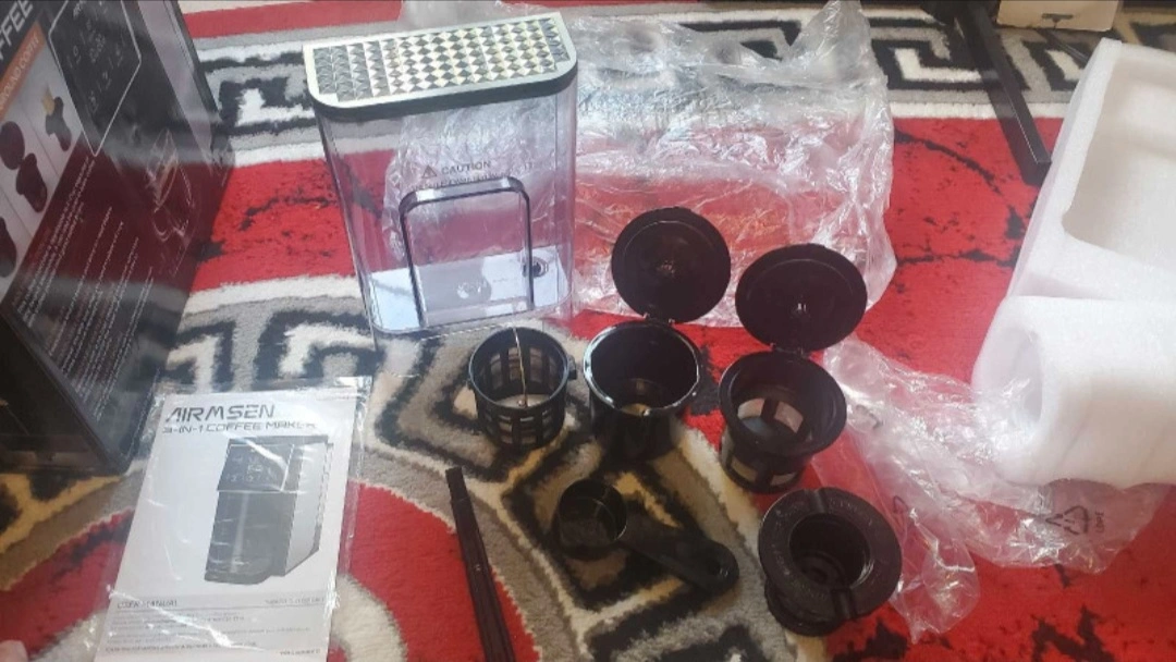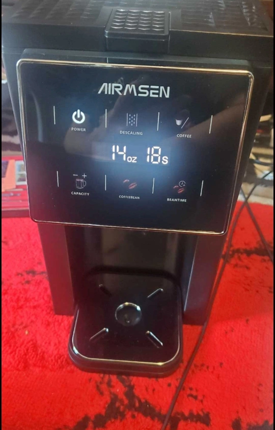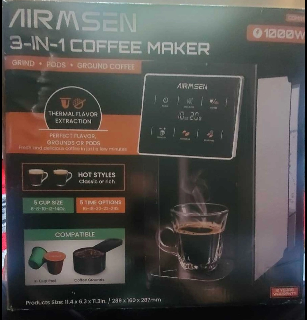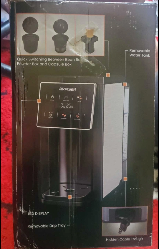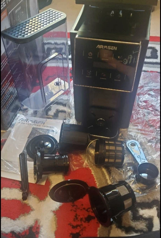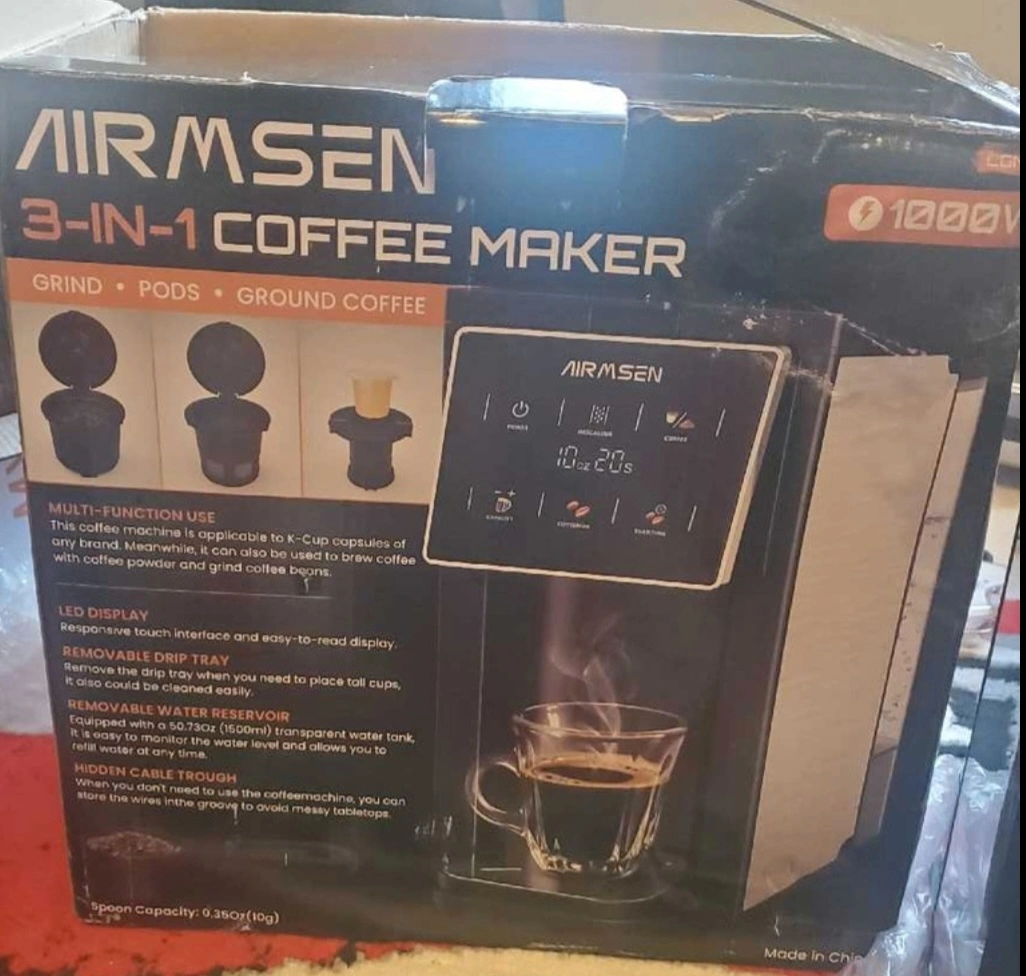 10Selling an Airmsen 3-in-1 Coffee Maker! It grinds, uses pods, and ground coffee. The box includes the removable drip tray, removable water tank, and a hidden cable trough. It also has an LED display. It's compatible with K-Cup pods and coffee grounds. The product size is 11.4 x 6.3 x 11.3 in / 289 x 160 x 287mm. Brand new Airmsen 3 in 1 Coffee Maker 1000w Touch screen. Please see the pictures It will come with:- 1. Original box 2. Coffee Maker 3. Manual 4. Bean Box 5. Capsule Box 6. Powder Box 7. Spoon 8. Brush 9. Upper cover, Drainage tray, Water tank