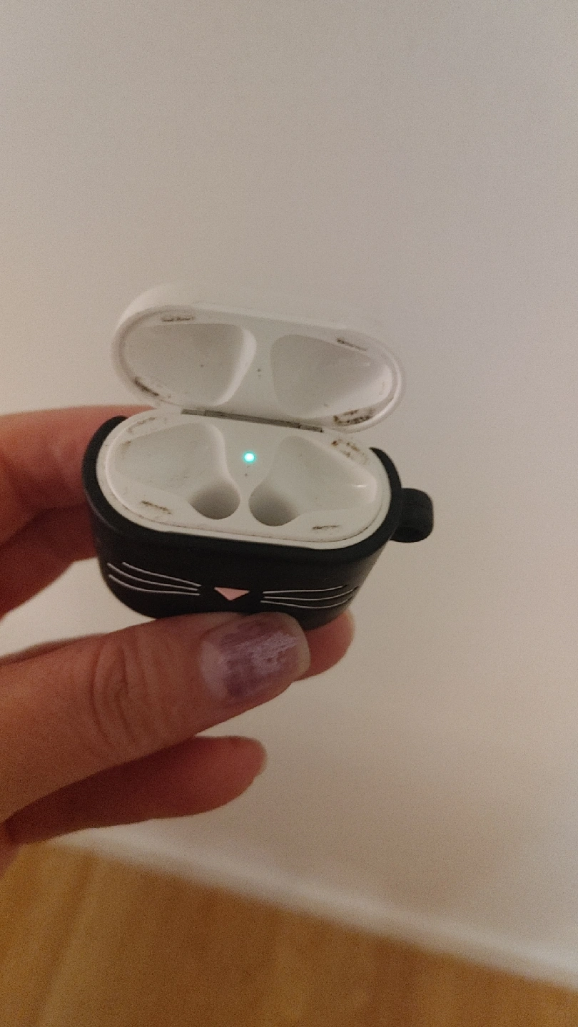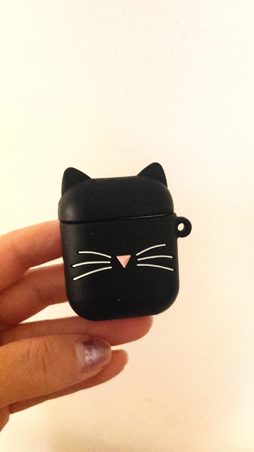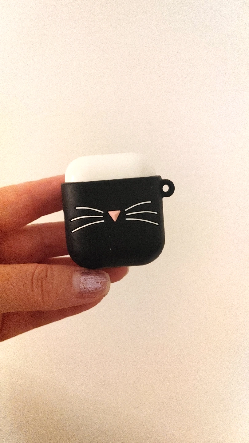 63Selling an AirPods charging case with a cute black cat silicone case! It has a black silicone case with a cat design on it. The charging port is visible at the bottom of the case.