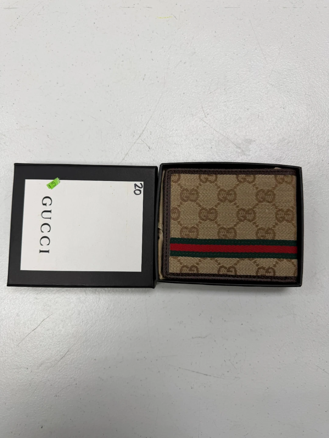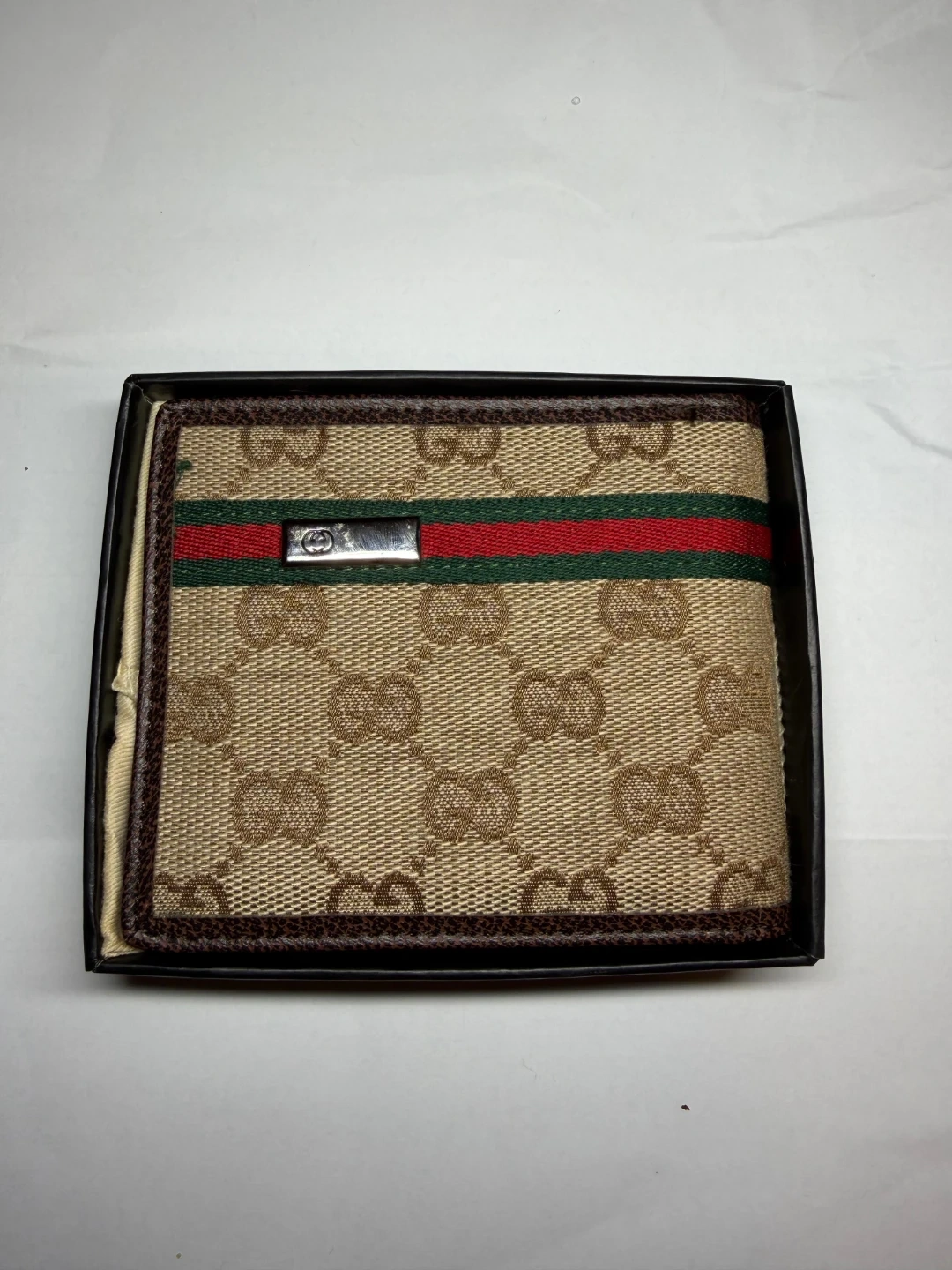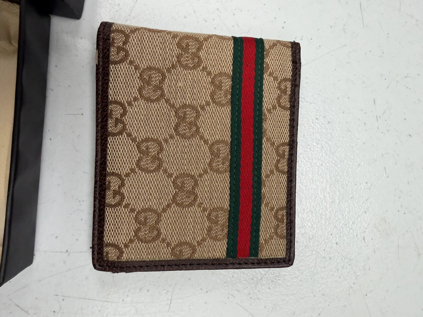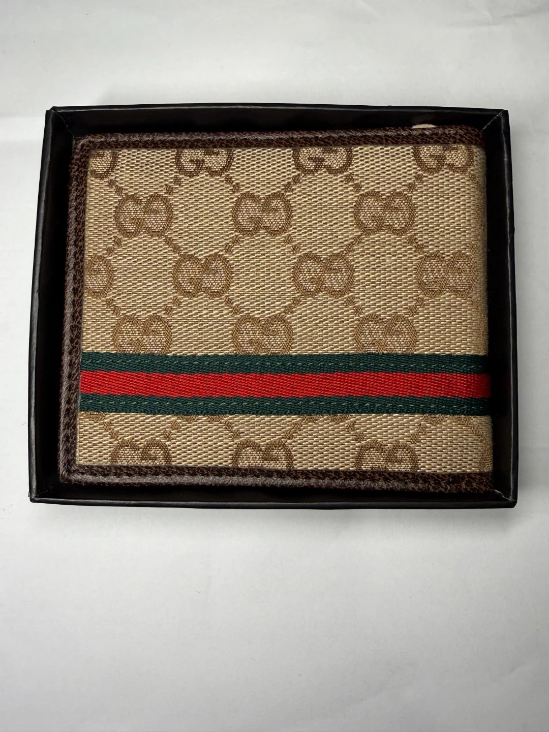 Gucci bi-fold wallet in signature monogram canvas. Features the classic red and green stripe detail. Includes original box and dust bag.