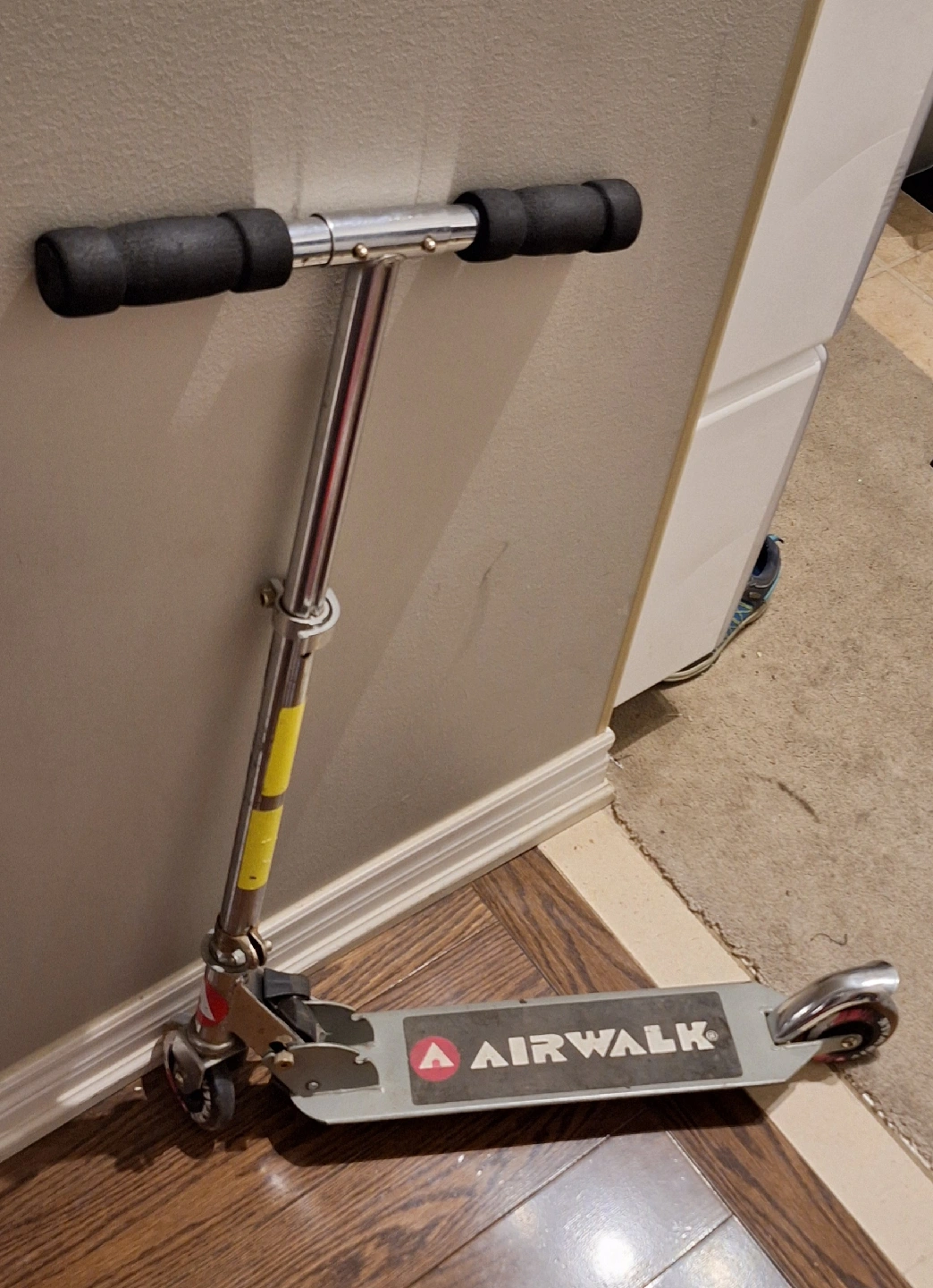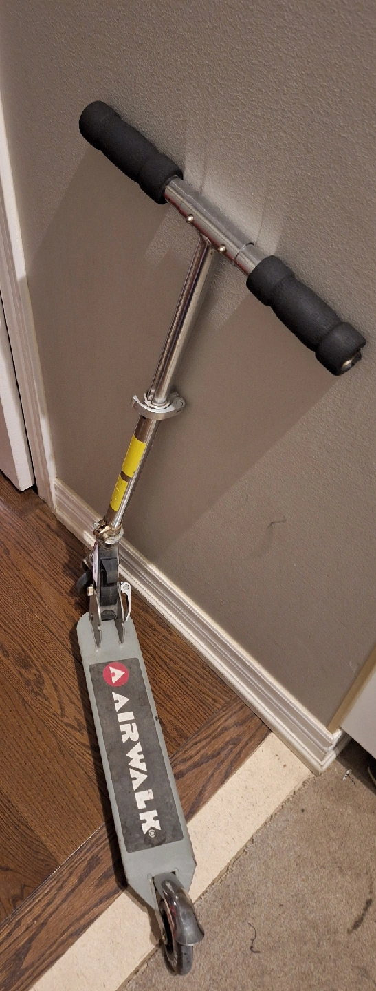 Selling an Airwalk folding kick scooter in grey. It's in good condition and ready for some fun rides. Perfect for getting around the neighbourhood or just enjoying the outdoors. It's foldable for easy storage.