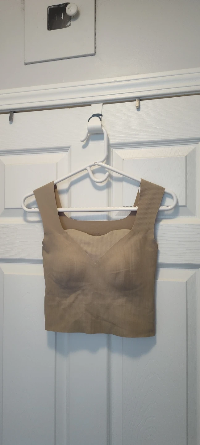 Comfortable ribbed crop top with a square neckline. It's made from a soft, stretchy fabric. This top is sleeveless with built-in cups and hits at the waist. It's great for layering or wearing on its own!