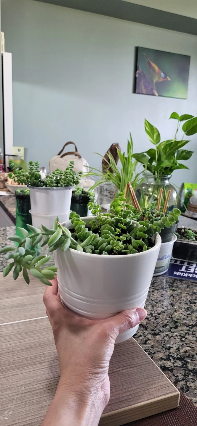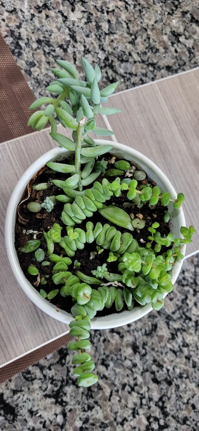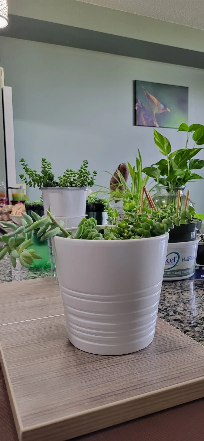 Multiple succulents in a white Ikea ceramic pot.