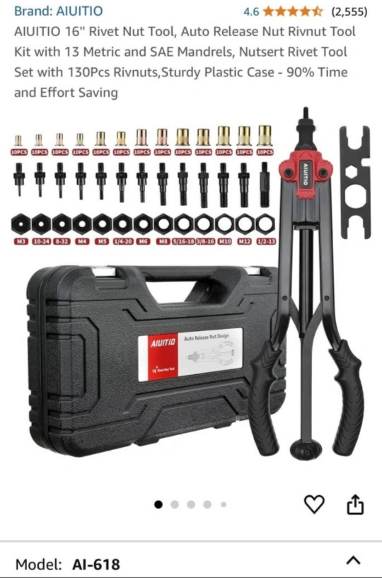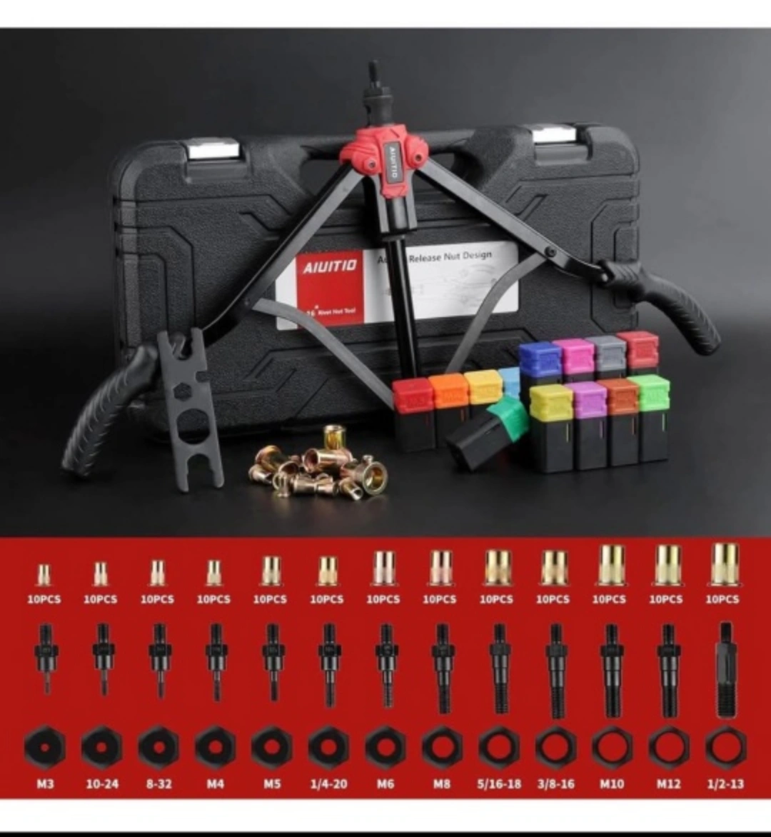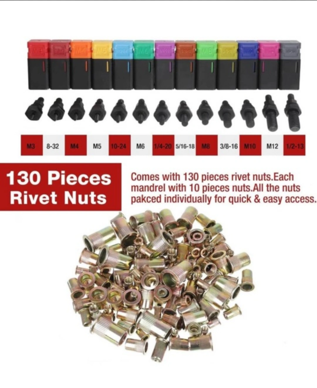 102130-piece rivet nut set. Includes 13 mandrels. Auto-release design. Sturdy plastic case. Metric and SAE sizes.