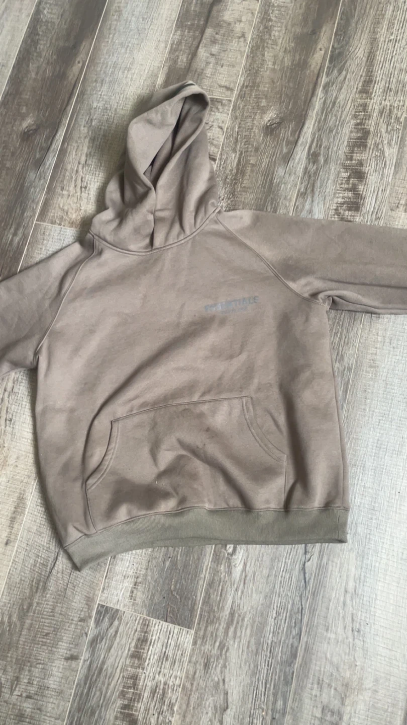 Brown ESSENTIALS hoodie with a kangaroo pocket. It's made of a soft material. This hoodie is great for casual wear.