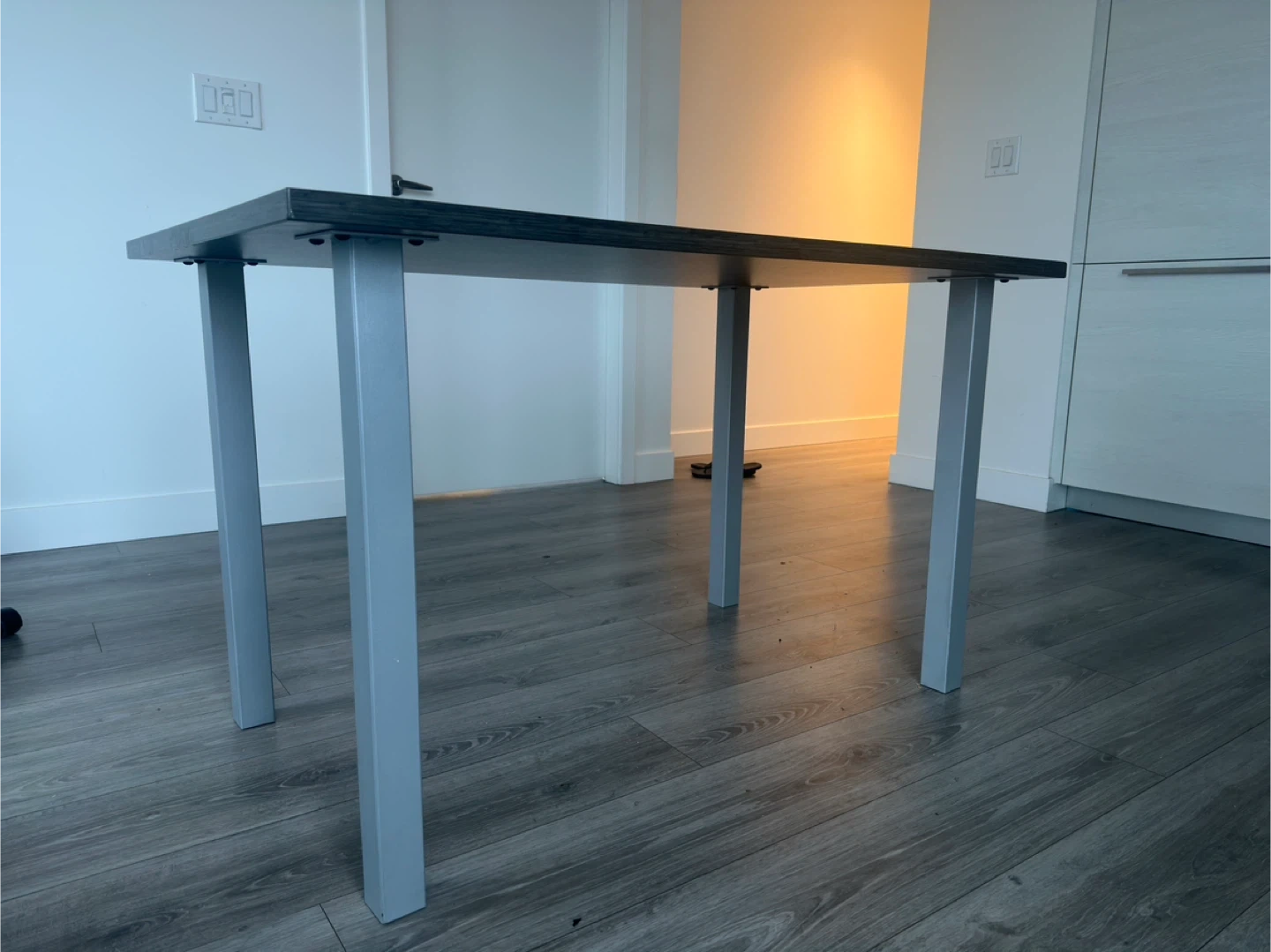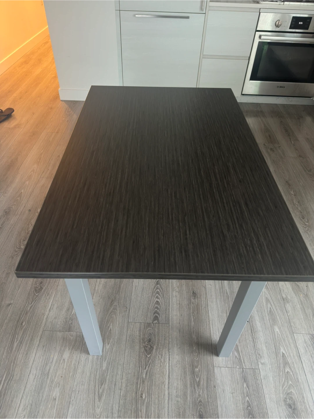 A simple dining/ Office table featuring a dark wood laminate top and sturdy silver metal legs. Its clean design makes it a versatile piece for any kitchen or dining area. It's perfect for smaller spaces or as an accent table.