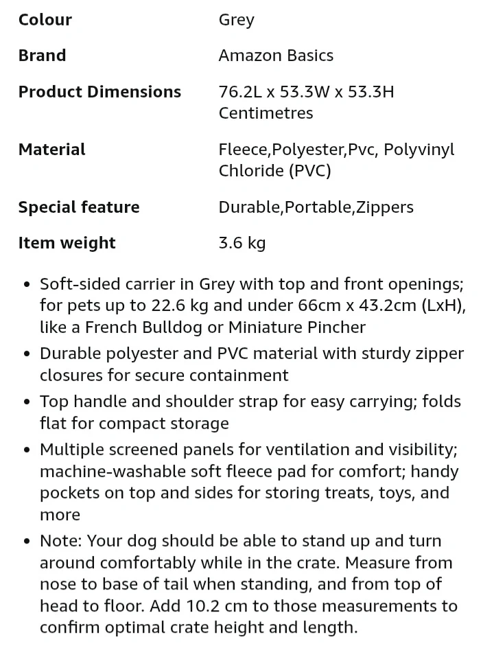This is an Amazon Basics premium folding portable soft pet crate in grey. It has convenient top and front openings with durable zippers for a secure closure. The crate also features connecting handles and an adjustable shoulder strap for easy carrying.