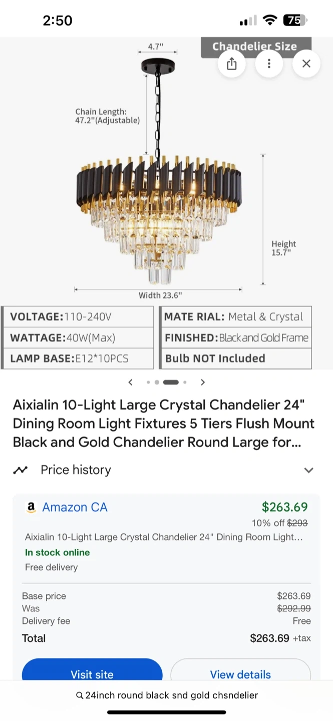 12Selling an Aixialin 10-Light Large Crystal Chandelier! It's a 24" dining room light fixture with 5 tiers, featuring a flush mount design. The chandelier has a round, large black and gold frame. Originally bought for $263.69. The box is included!