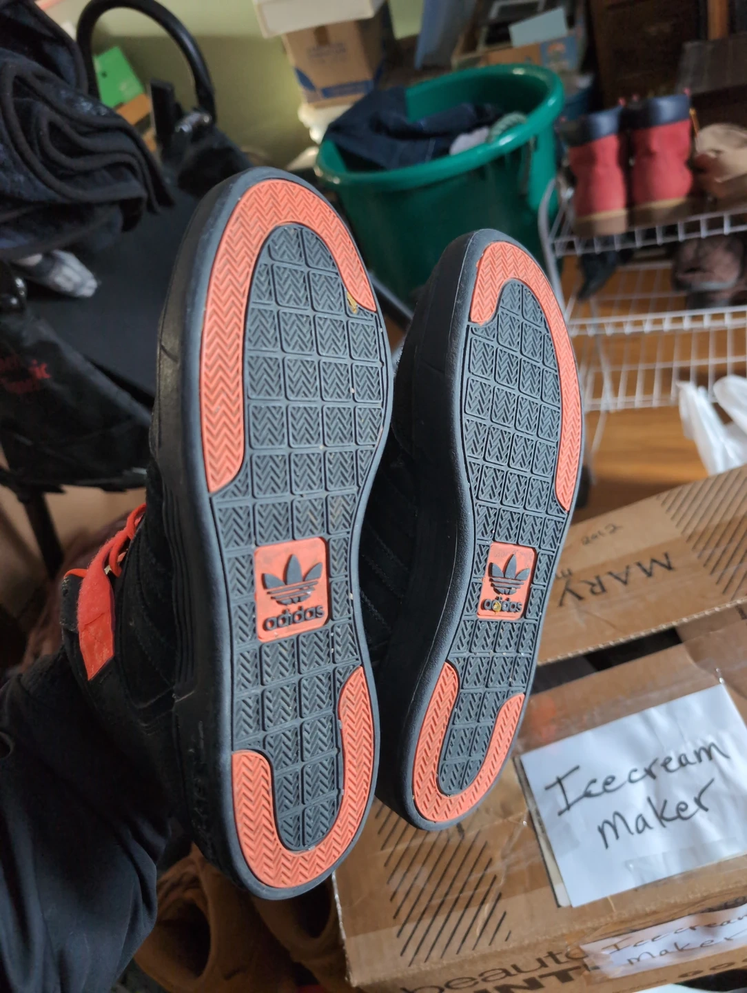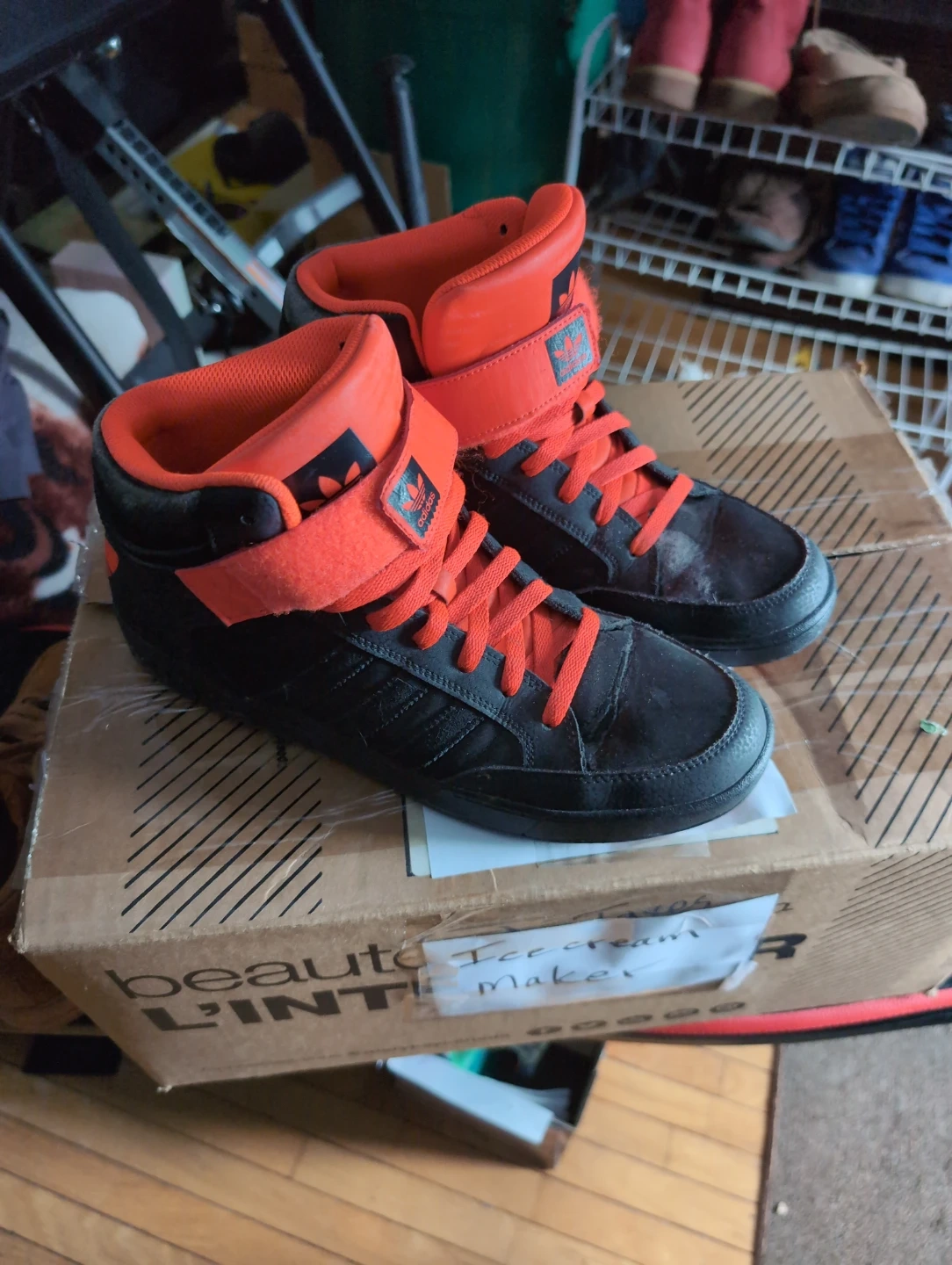 Black Adidas high-top sneakers with orange accents and laces. These shoes have a velcro strap closure over the laces. Durable rubber soles for good grip. Size 10. Signs of wear but overall great condition. Asking $60