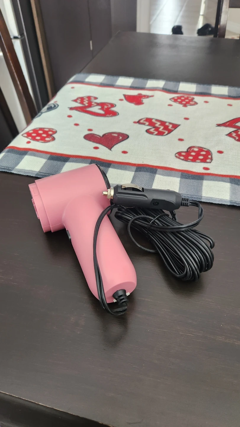 This is a pink car vacuum cleaner. It comes with a crevice tool and a brush attachment. It plugs into your car's 12V outlet for power. It's great for cleaning up small messes in your vehicle!