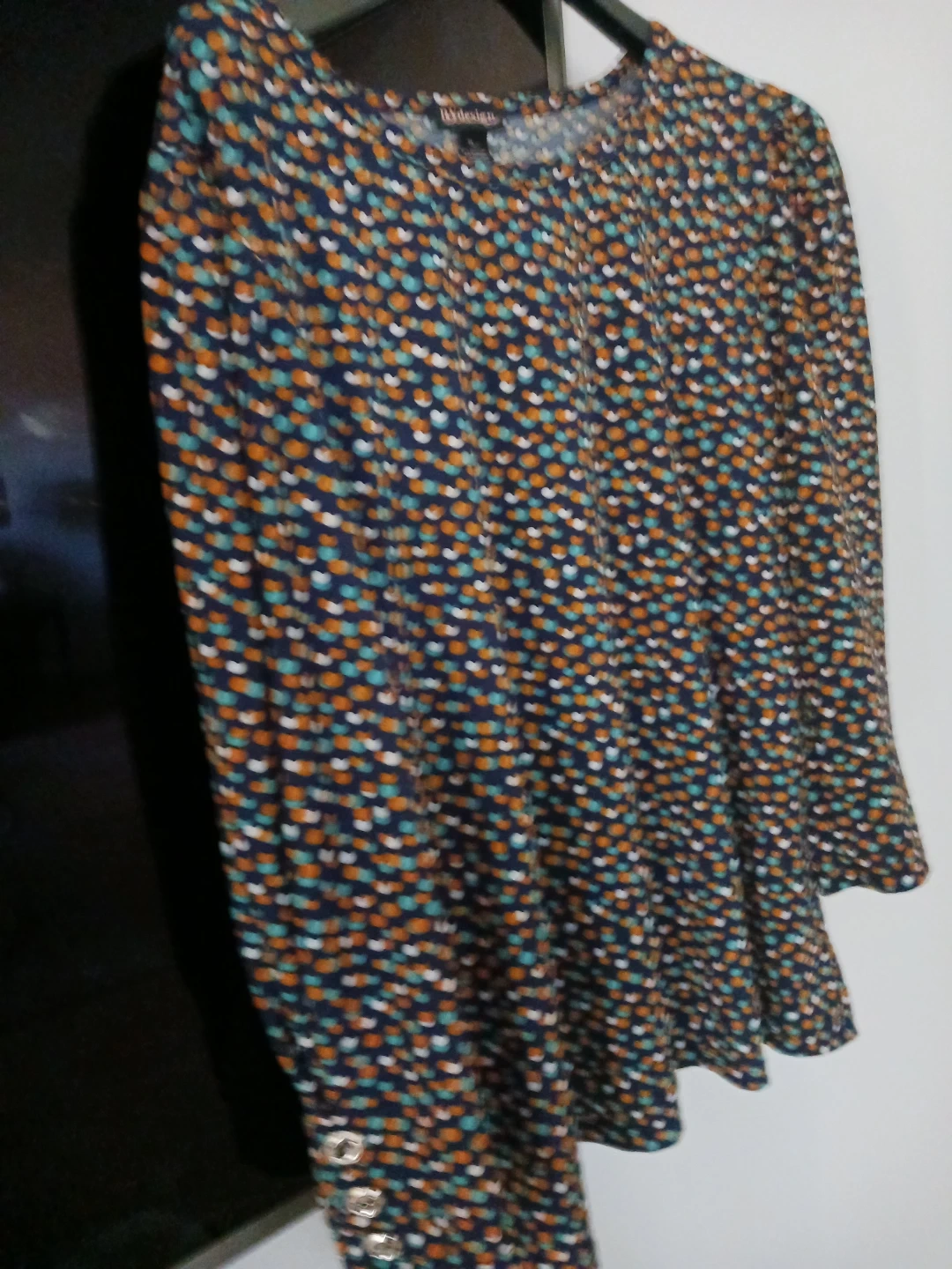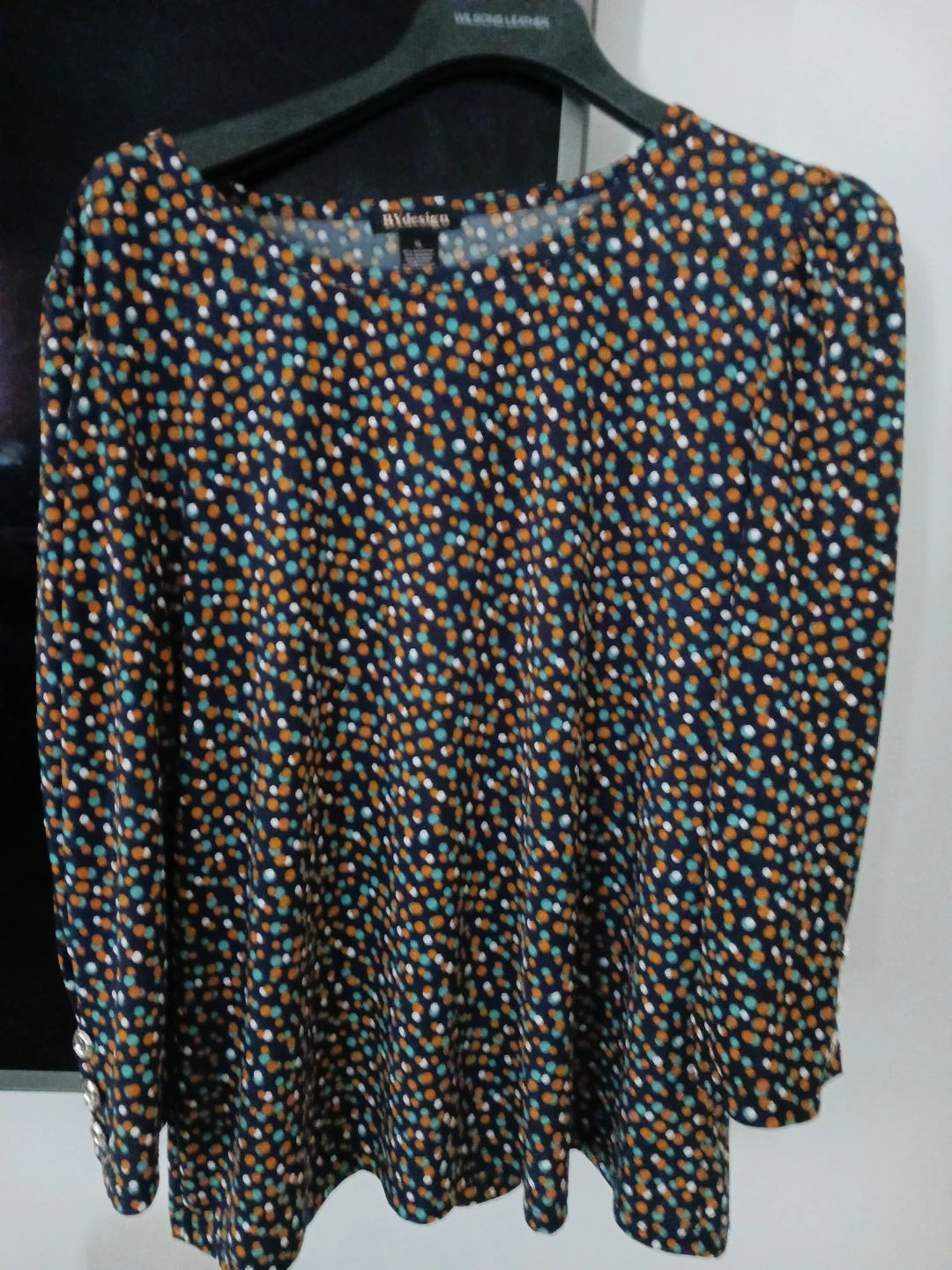 This BY DESIGN women's long sleeve top comes in a navy blue base with a scattered dot print featuring orange, teal, and white. It has a relaxed fit and decorative button details on the cuffs. Size is medium. It's great for casual wear.