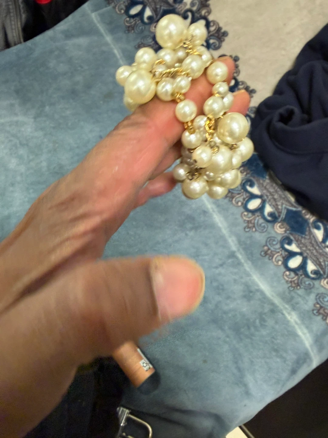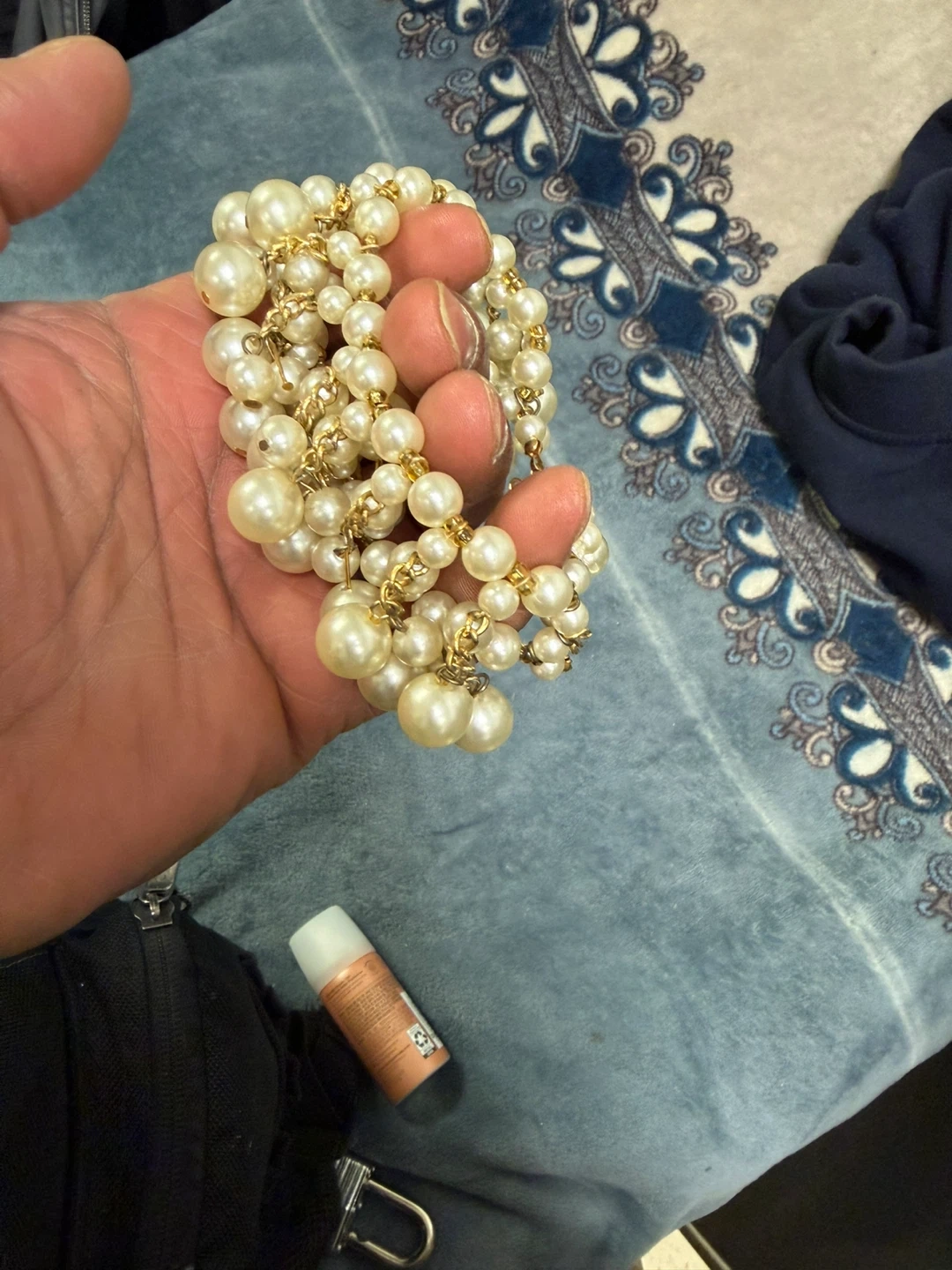 This is a vintage-style necklace with multiple strands of faux pearls. It features a gold-tone chain and clasp. The pearls have a lovely luster. It's a statement piece that adds elegance to any outfit! The connector to close is slightly broken.