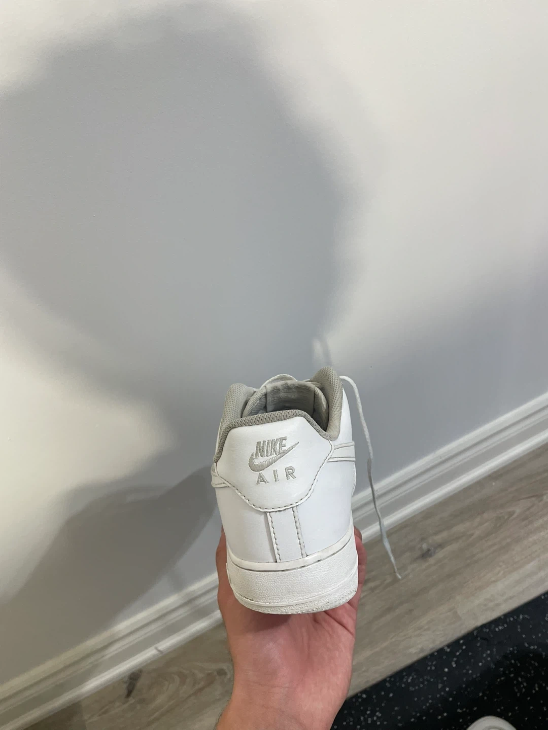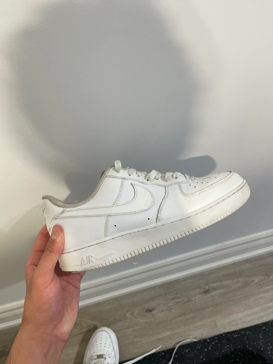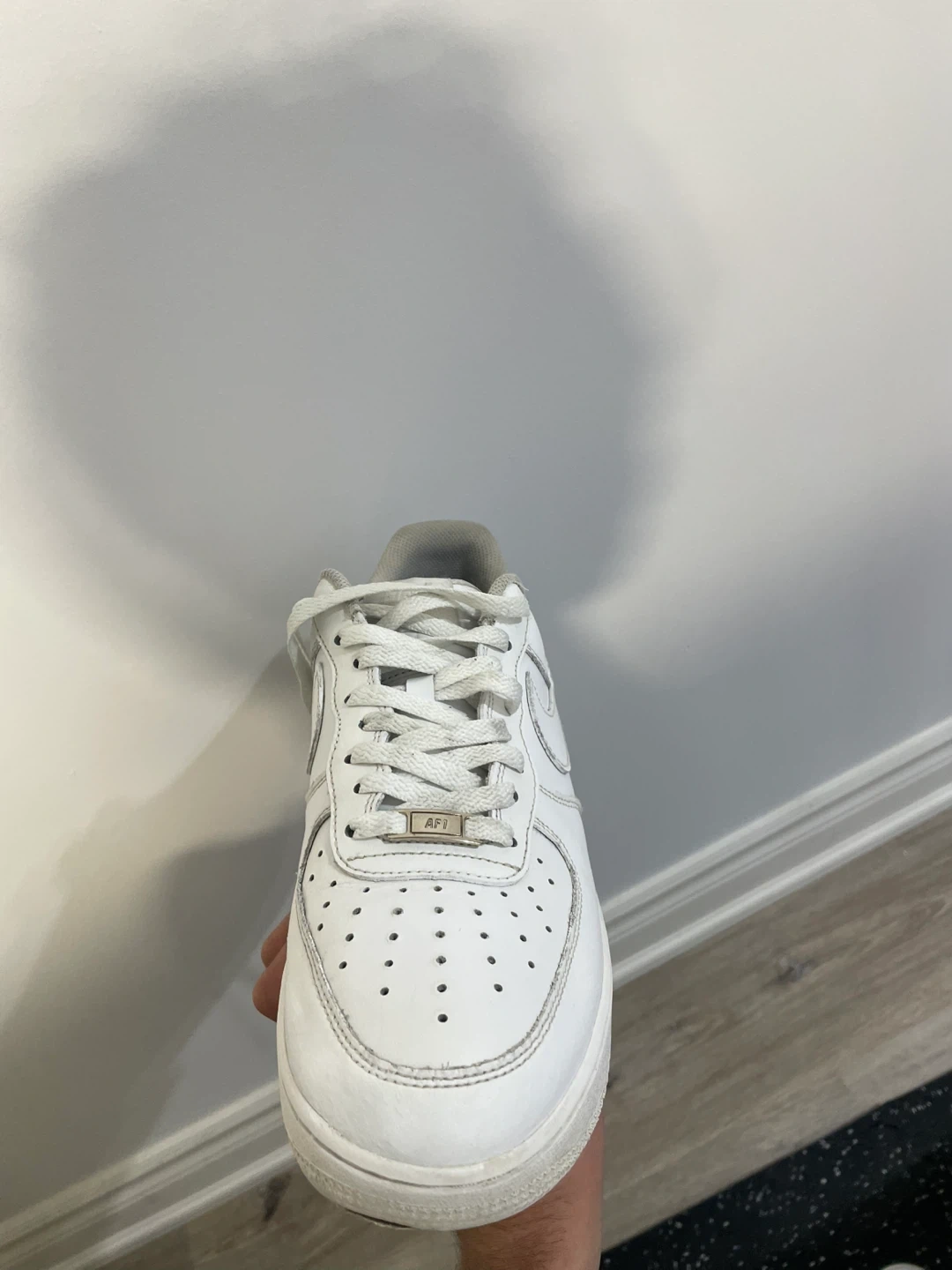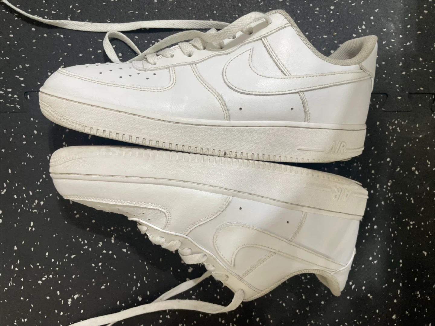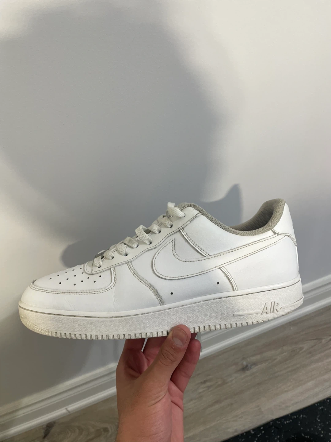 Classic white Nike Air Force 1 sneakers. These are a staple for any sneaker collection. Leather upper and rubber sole.
