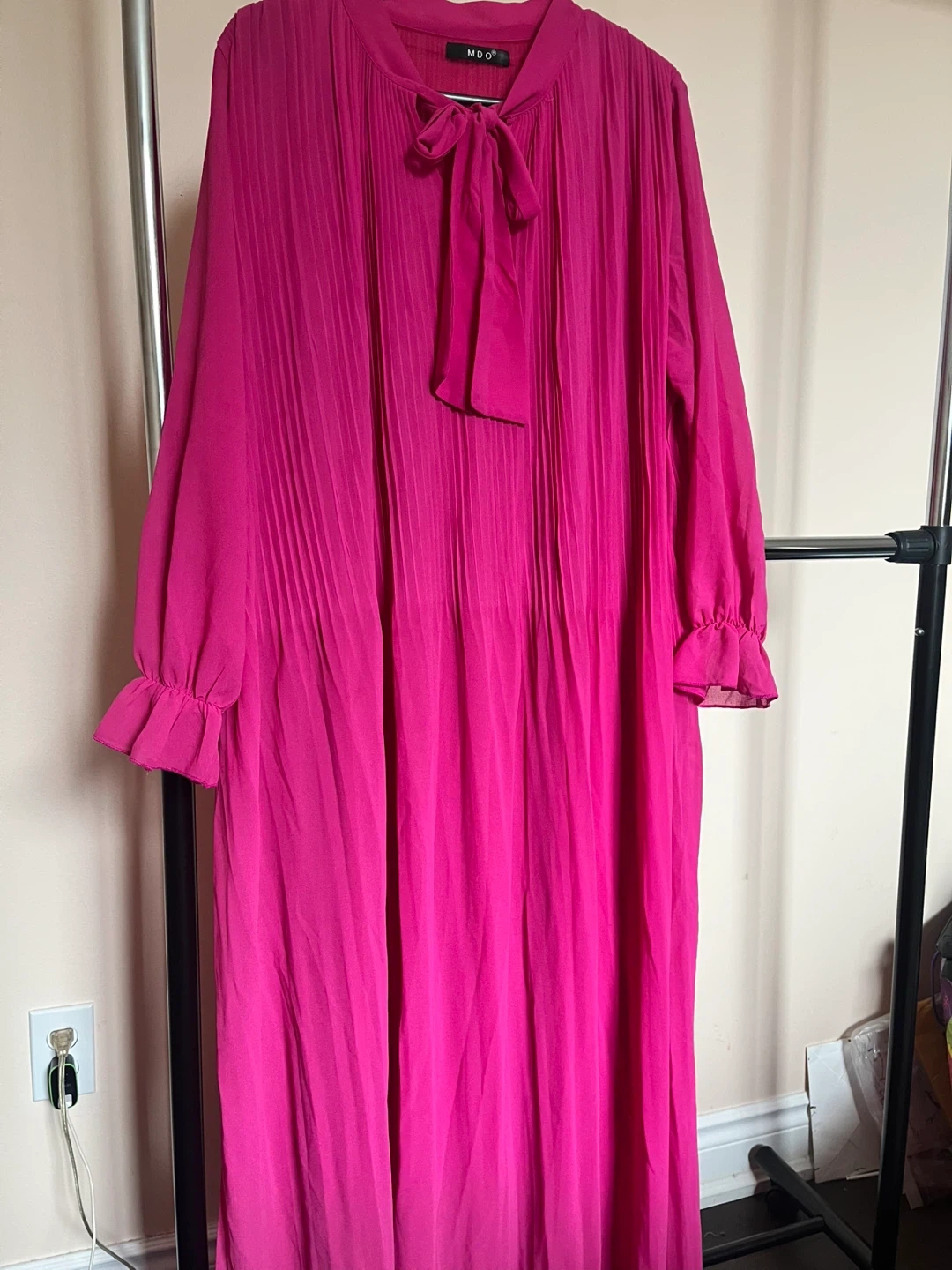 This is a lovely pink maxi dress with a pleated design. It features a pussy bow tie at the neckline and ruffled cuffs on the long sleeves. The dress is a vibrant shade of pink and has a flowing silhouette. Perfect for Baby Shower 🌸
