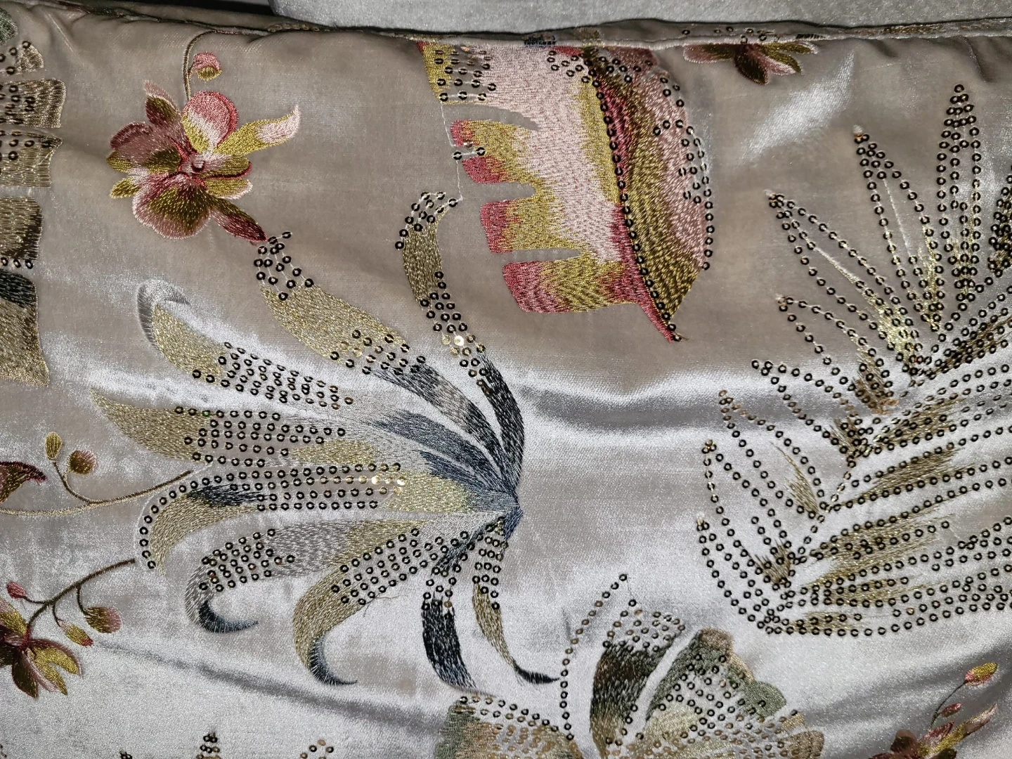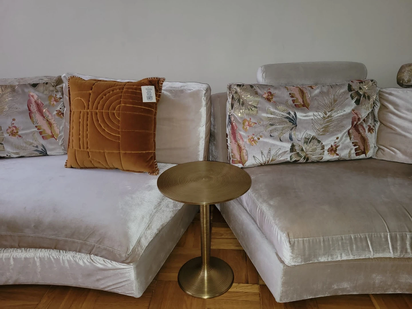 Selling a stylish curved sectional sofa in beige. The sofa features a unique design with embroidery and decorative pillows. Spacious and comfortable, it's a great piece to add to any living space!