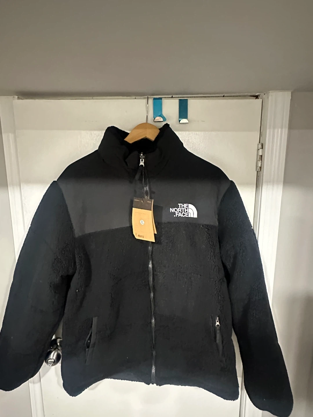 A cozy dark blue fleece jacket from The North Face. It's made with a sherpa fleece material on the lower half and a smooth nylon overlay on the upper chest and shoulders. It has a full zip front and zippered hand pockets, which is also reversible into a windbreaker. It is negotiable.
