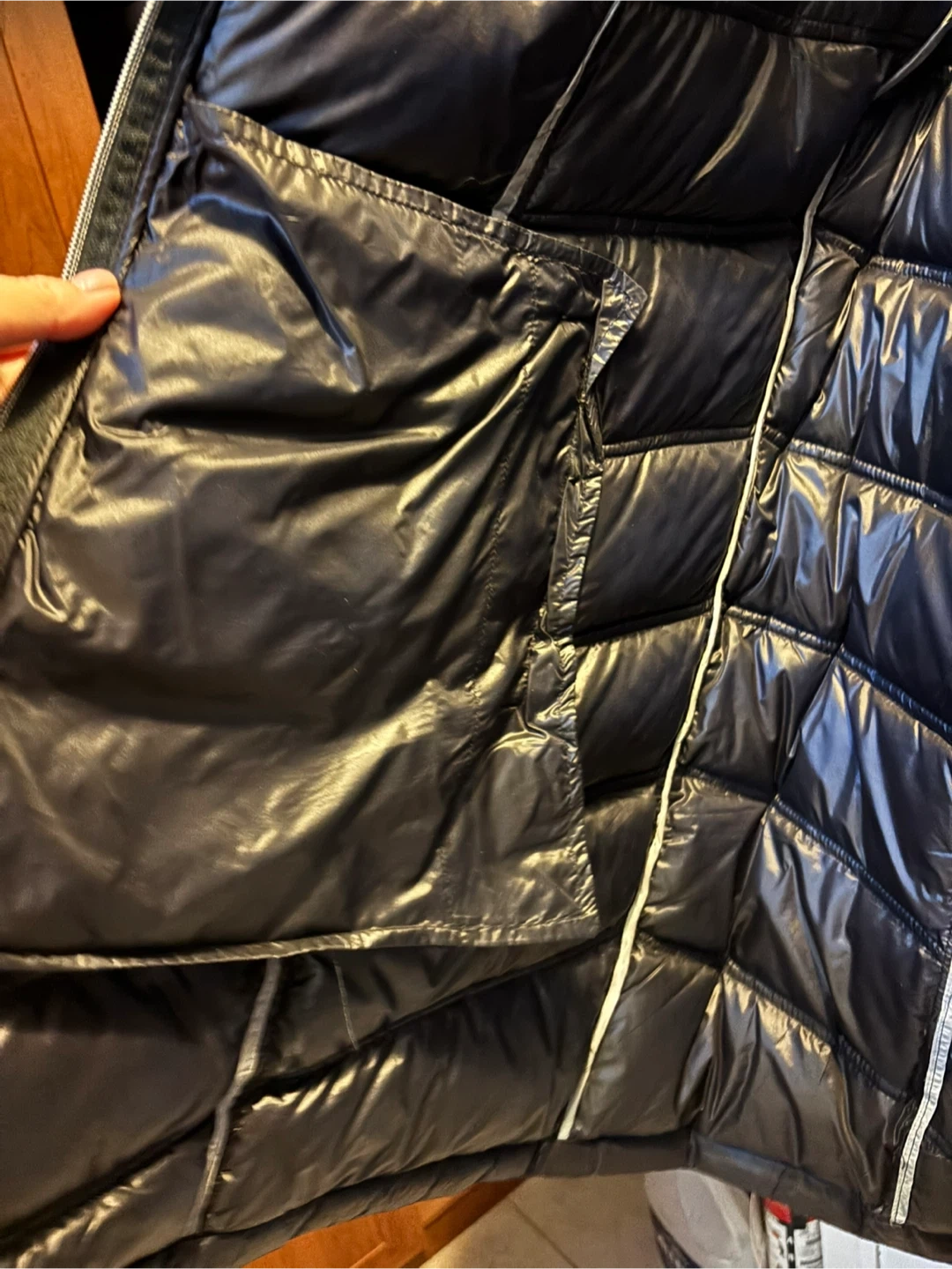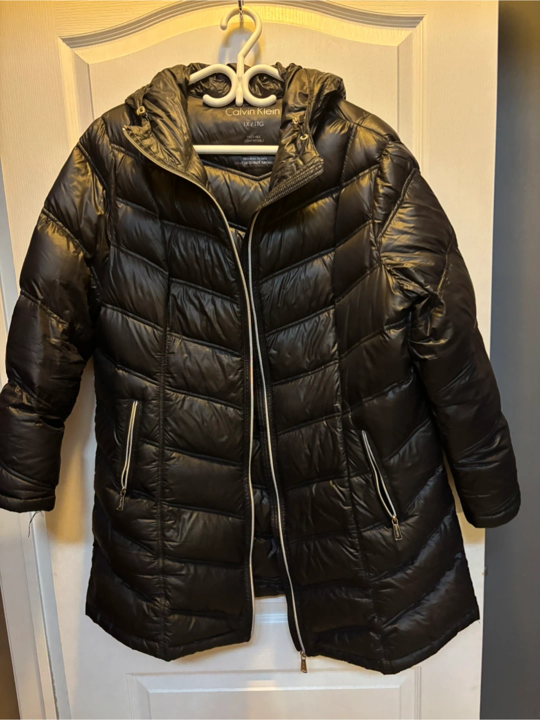 This Calvin Klein puffer coat is packable and lightweight. It's made with premium down for warmth. Features a hood and zippered pockets.