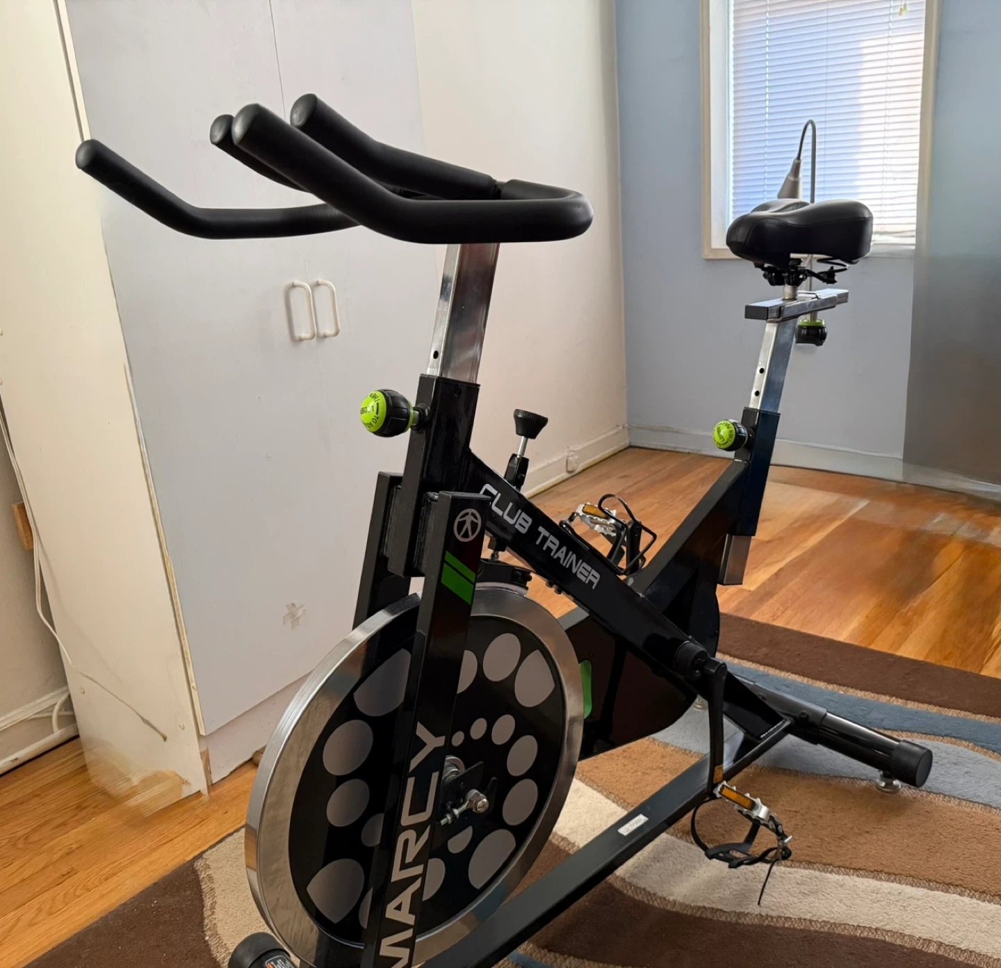 This Marcy Club Trainer spin bike is perfect for home workouts. It features adjustable resistance and upgraded pedals (which I added myself). The bike has a comfortable, adjustable seat and is very sturdy. Amazon is currently selling this same bike new for $439. I purchased this bike in late 2024 and have only used it a few times.