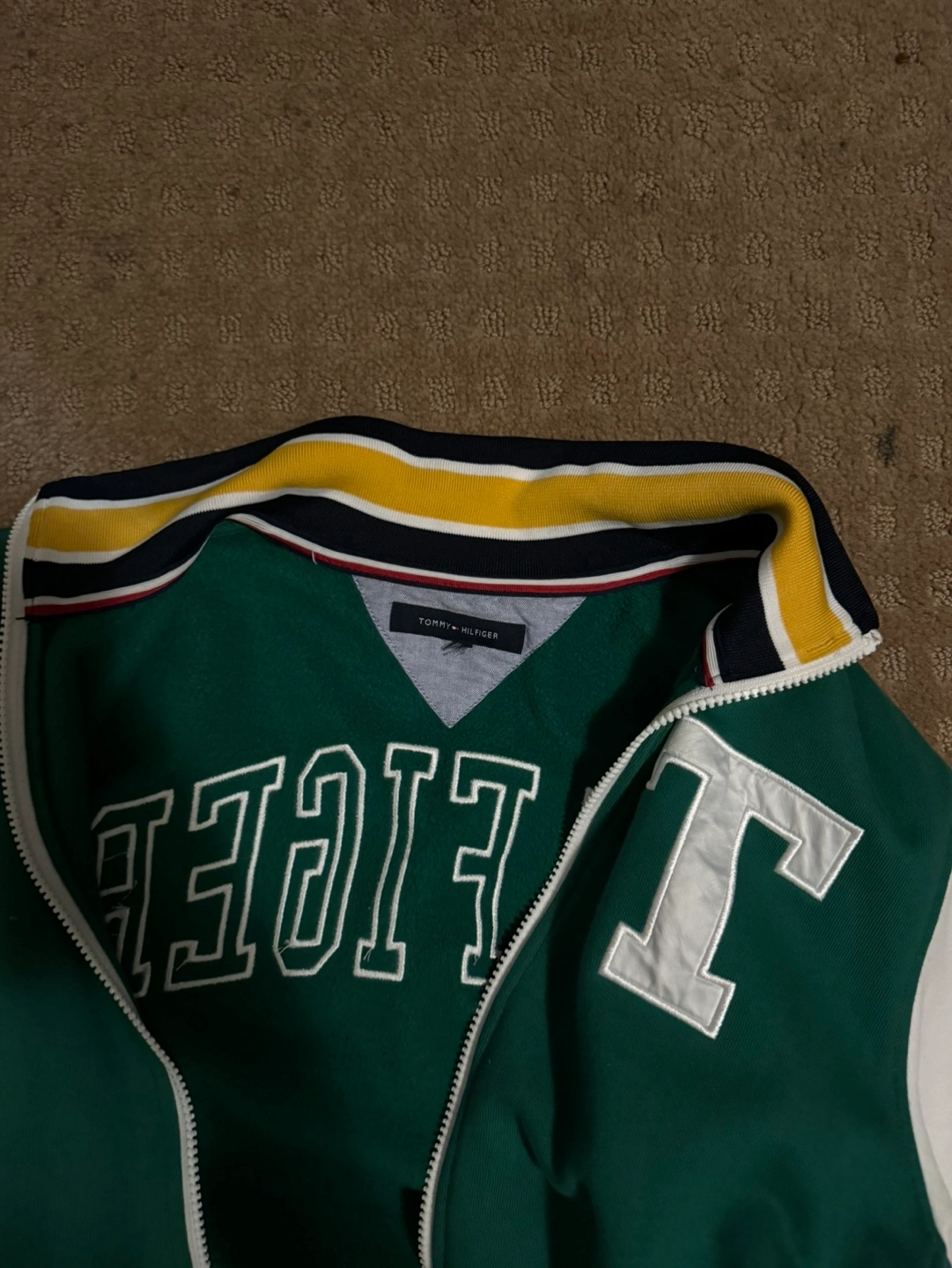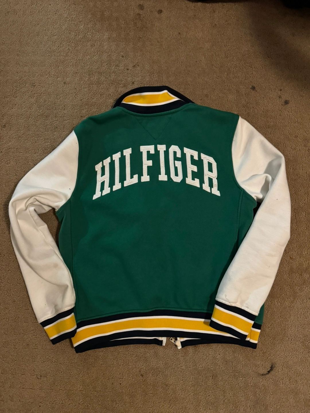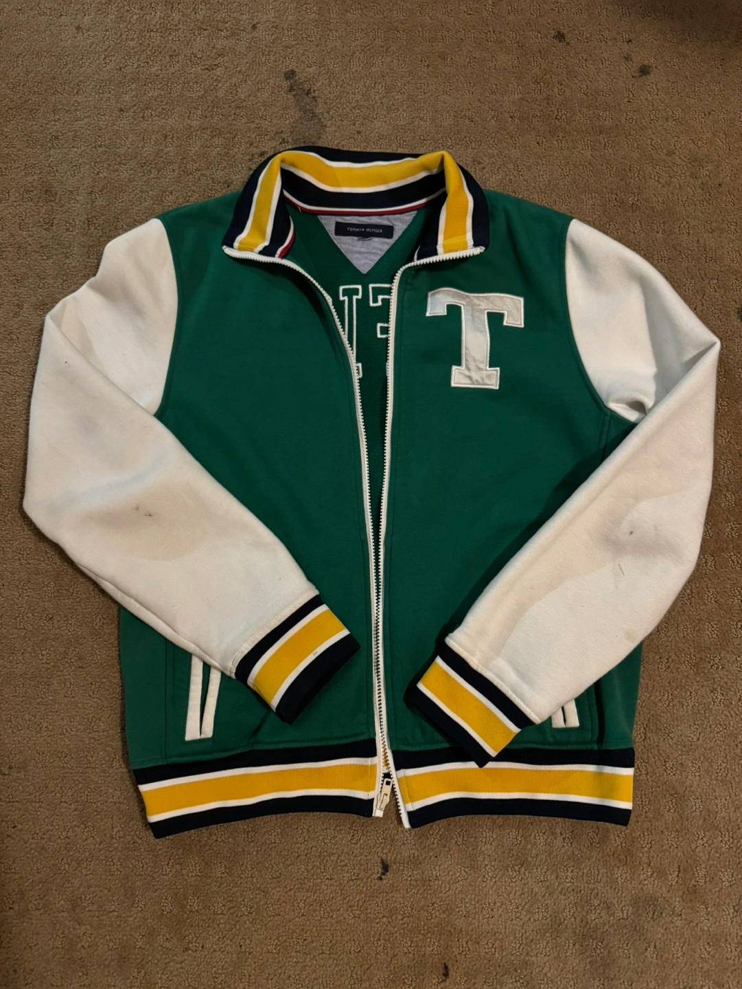 Green and white varsity jacket. Features a contrasting colour block design. Zip-up front. Tommy Hilfiger branding. Great for layering.