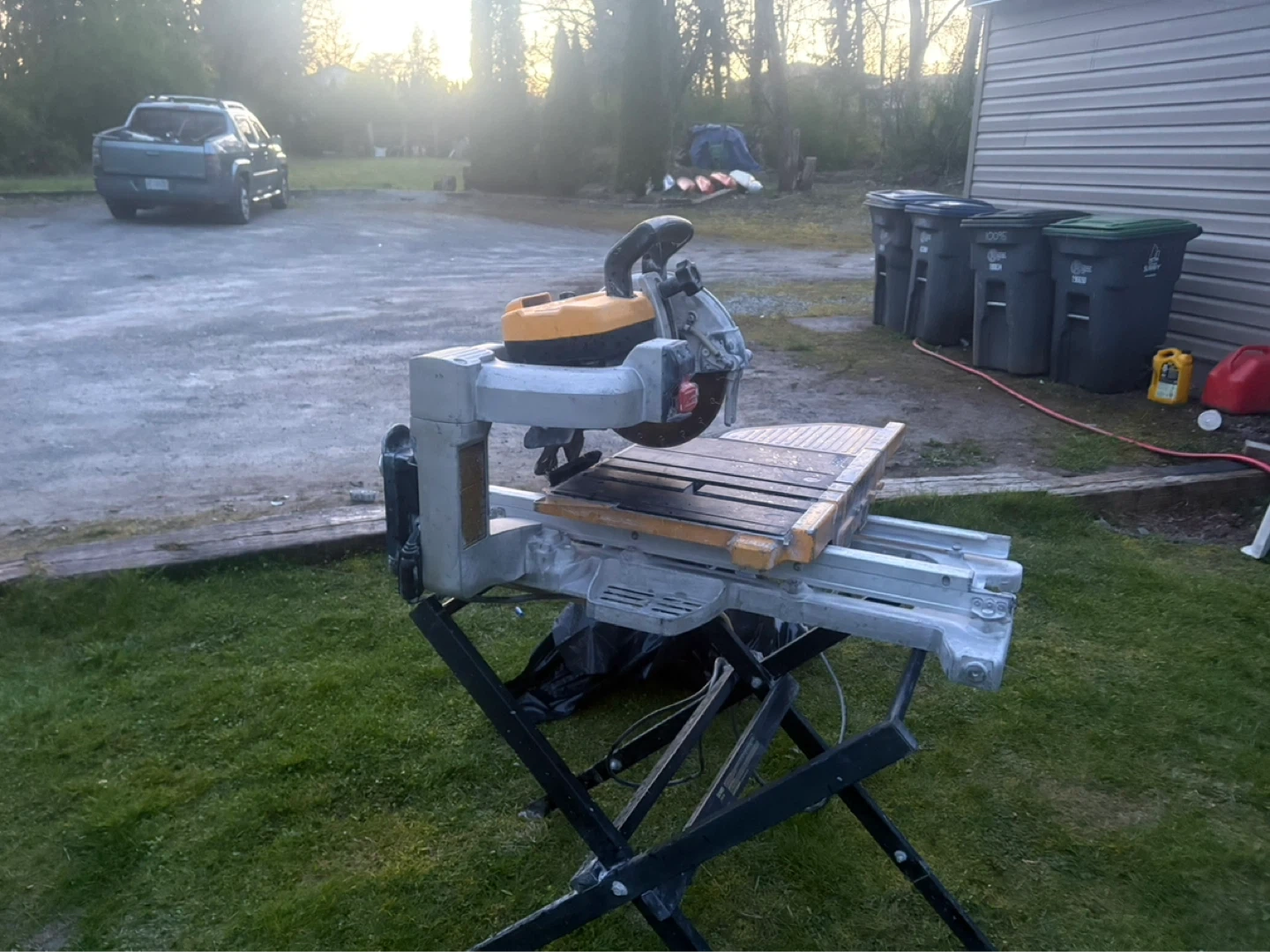This tile saw includes a folding stand and is covered by a three-year limited warranty