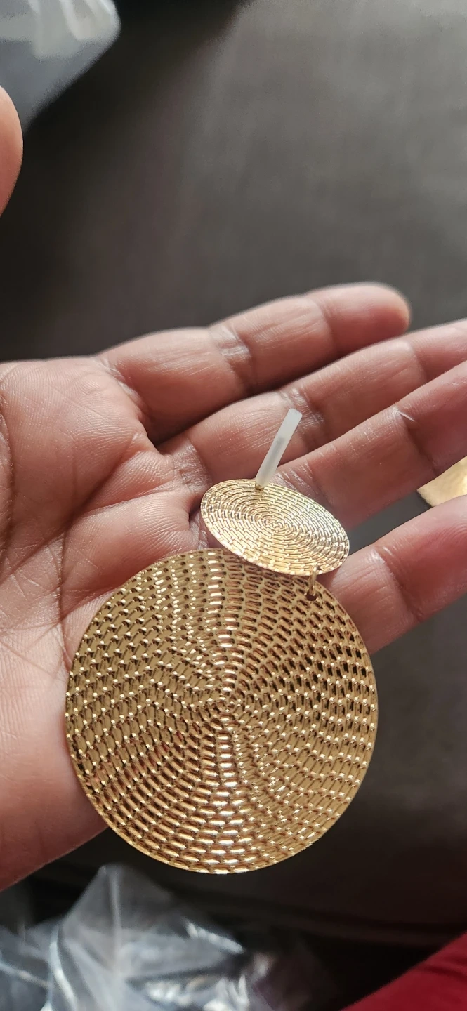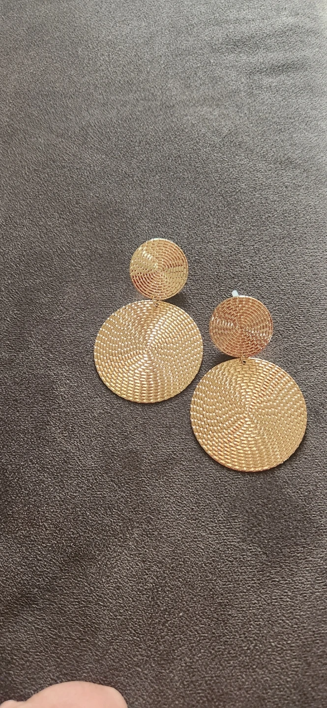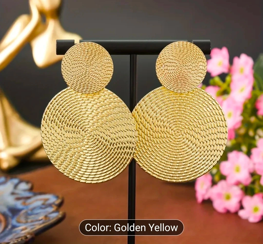 These golden yellow round drop earrings are brand new and ready to add a touch of shine to your outfit! They feature a unique woven texture and a stylish, eye-catching design. The length is 5.6cm (2.2 inches) and the diameter of the large circle is 4cm (1.57 inches)