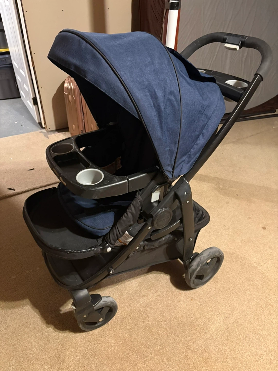 A versatile baby stroller in a deep navy blue colour. It includes a parent tray with cup holders and a storage basket underneath. The stroller has a foldable design for easy transport. This stroller is great for getting around town with your little one!