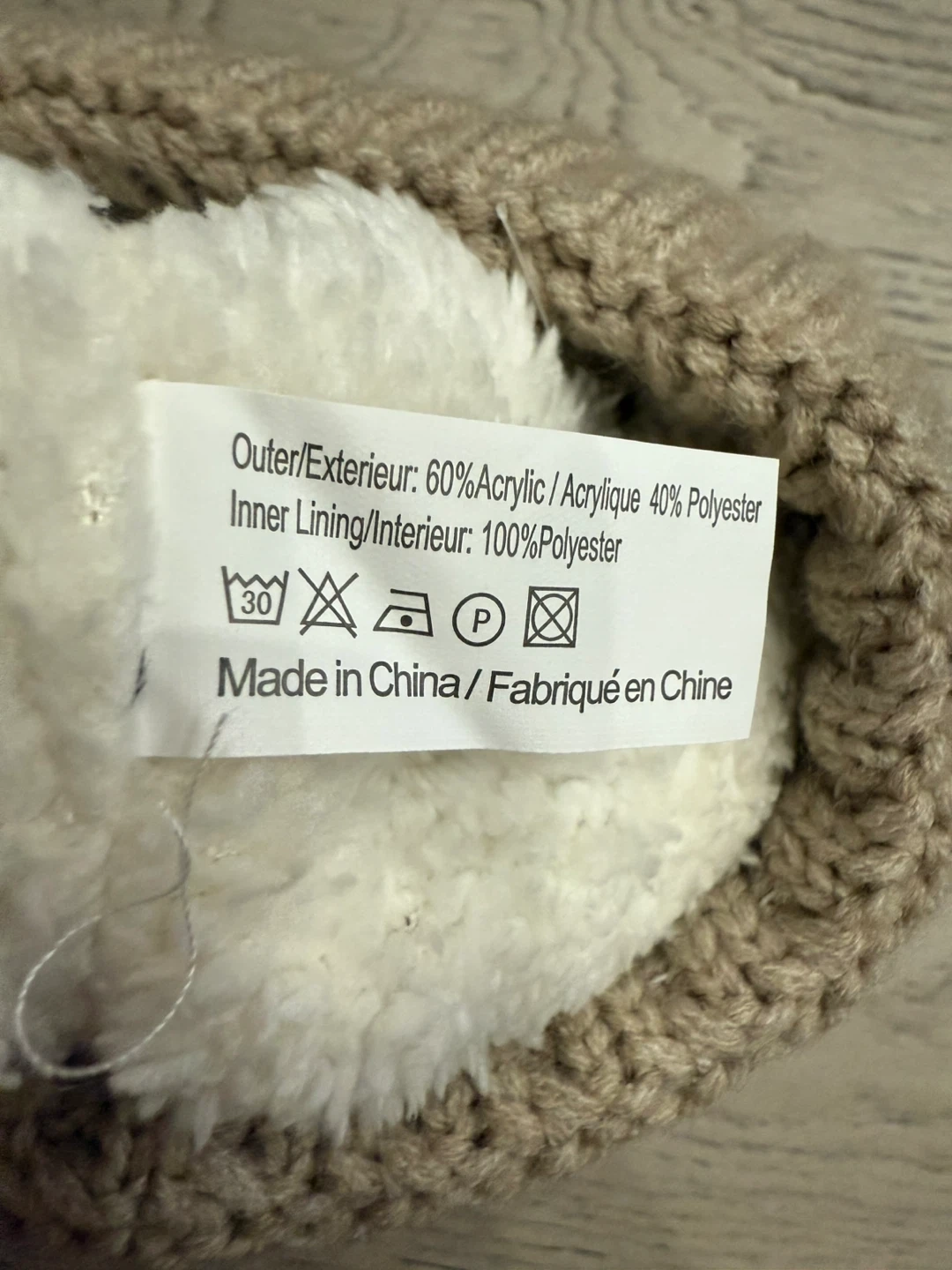 Keep cozy with this cute beige knit toque! It's made with a blend of 60% acrylic and 40% polyester, and the inner lining is 100% polyester. Perfect for those chilly Canadian days!